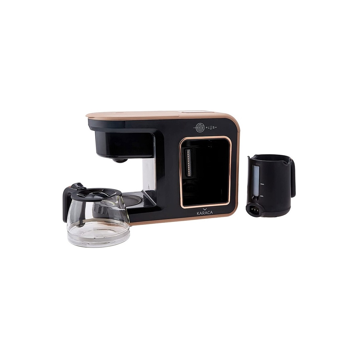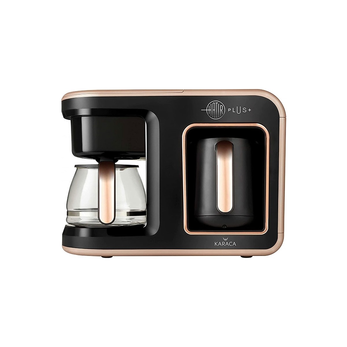 Karaca Hatır Plus 2 in 1 Kahve Makinesi eş zamanlı olarak hem filtre hem de türk kahvesi yapabilme özelliğine sahiptir! Yıkanabilir paslanmaz çelik filtresi, ideal demleme sıcaklığını otomatik belirlemesi, kahveniz hazır olduğunda uyarı sistemiyle sizi bilgilendirmesi ve filtre kahveyi 30 dakika sıcak tutabilme özelliği ile öne çıkan bu harika kahve makinesi, tek seferde 5 kişilik Türk kahvesi ve 5 kişilik filtre kahve yapabilme kapasitesine de sahip. Böylece misafir ettiğiniz kalabalık arkadaş grubuna ya da aile toplantılarına kısa sürede enfes kahveler hazırlayabilirsiniz.