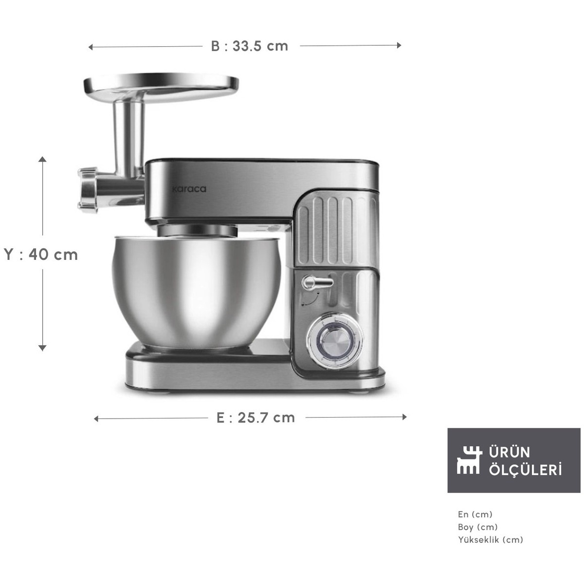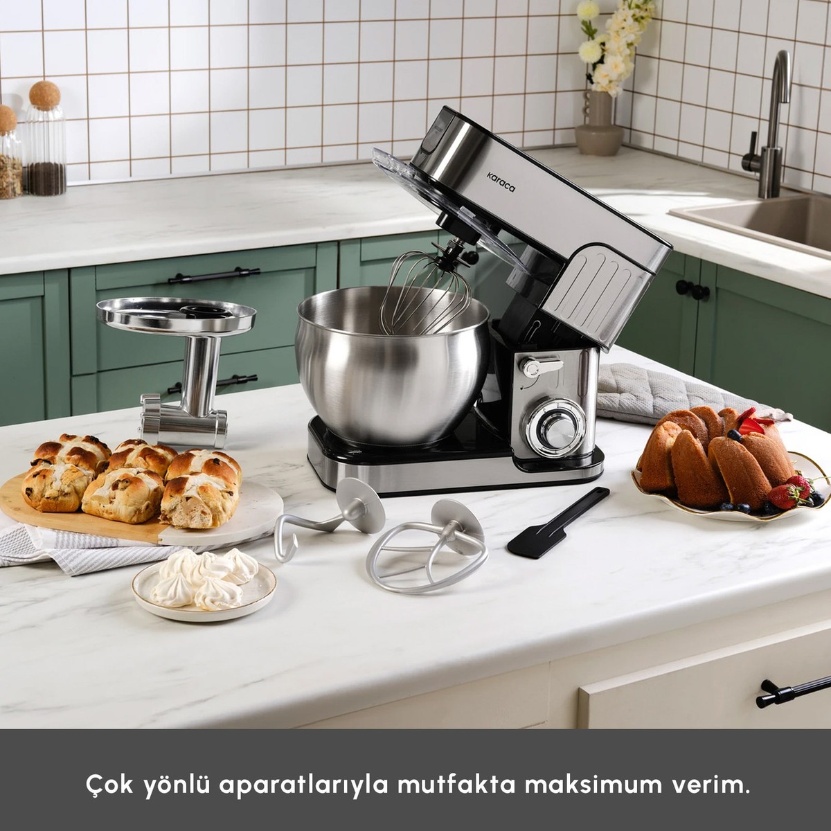 Karaca Inoxchef Pro Stand Mikser, 1300W gücündeki motoru ile güçlü ve verimli bir kullanım sunar. Sadece çırpma, karıştırma ve yoğurma işlemlerinde değil, kıyma çekme, sucuk-sosis yapma ve köfte hazırlama işlemlerinde de mükemmel bir yardımcıdır. 3 farklı kıyma aparatı ve ekstra dayanıklı yapısı sayesinde geniş mutfak işlerini rahatlıkla halledebilirsiniz. 7 litrelik paslanmaz çelik haznesi, büyük miktarlardaki karışımları dahi hızla hazırlar. Şeffaf sıçrama önleyici kapağı ve 6 kademeli hız ayarıyla güvenli bir kullanım sağlar. Bu çok amaçlı mikser, düşük eforla hamur yoğurma, yumurta çırpma ve nefis kekler yapma konusunda uzmanlaşmıştır. Aparatlarıyla kıyma makinesi haline de gelebilen bu profesyonel mutfak ürünü, enerji ve zamandan tasarruf etmek isteyenler için vazgeçilmezdir.