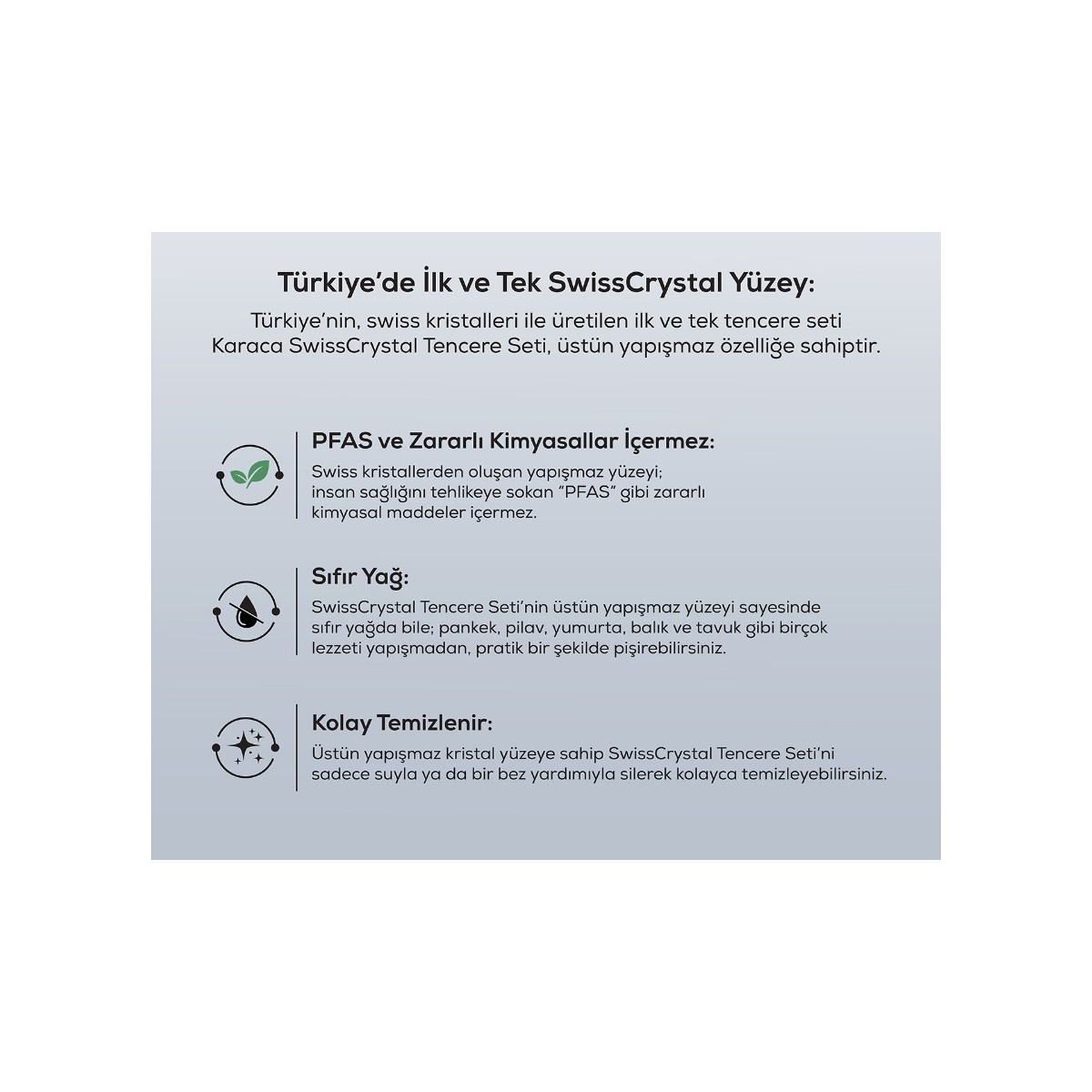 - Türkiye’de İlk ve Tek SwissCrystal Yüzey: Türkiye’nin, swiss kristalleri ile üretilen ilk ve tek tencere seti Karaca SwissCrystal Tencere Seti, üstün yapışmaz özelliğe sahiptir.