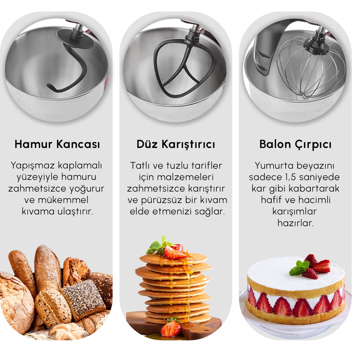 - 2000 Watt’lık yüksek motor gücüyle en sert hamurları bile zahmetsizce yoğurur, güçlü performansıyla fark yaratır.