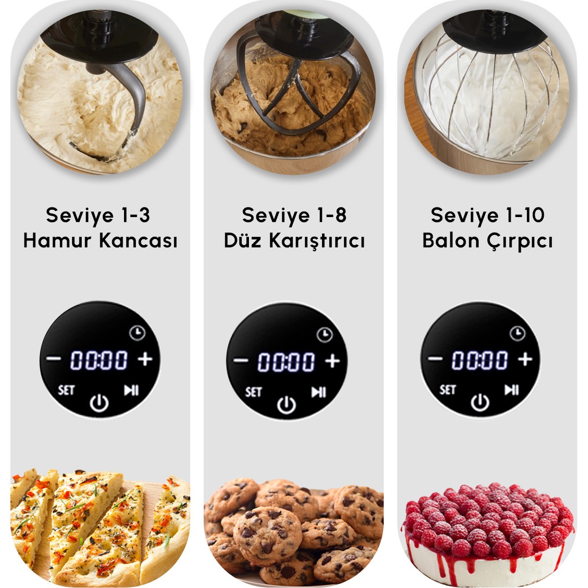 - 2000 Watt’lık yüksek motor gücüyle en sert hamurları bile zahmetsizce yoğurur, güçlü performansıyla fark yaratır.