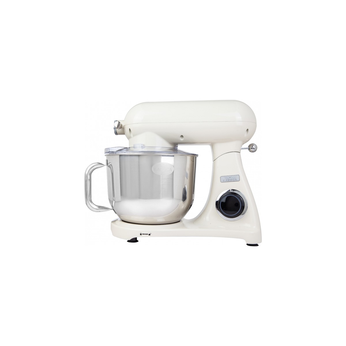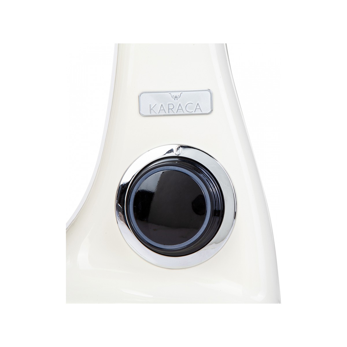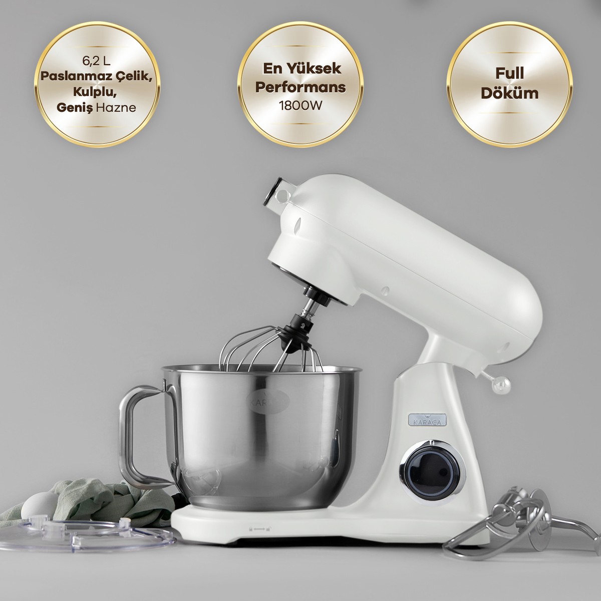 Karaca Powercast Chef Döküm Stand Mikser 1800W Mutfak Şefi Cream Özellikler Özel tasarımlı Karaca logolu, 6,2 litrelik paslanmaz çelik, kulplu, geniş kasesiyle tek seferde 1,5 kg hamuru hızlıca karıştırır. 1800W güçteki motoru ile piyasadaki muadilleri arasında en yüksek performansı sağlar. Powercast Chef komple döküm olduğundan, mutfakta en iyi performanslı sonuçları almanızı sağlar. 6 kademeli hız ayarı ve ek pulse özelliği ile pasta, ekmek hamuru, krep hamuru, çırpılmış krema gibi farklı gıdalarda istenen performansta işlem yapmanızı sağlar. Sabitleyici ayaklar sayesinde rahat ve kontrollü kullanılır. İşlem esnasında tezgahta kaymaz. Balon çırpıcı ile sıvı karışımları hızlı ve homojen şekilde karıştırmanızı sağlarken, elde edilmek istenen hamur düzeyine göre kullanılabilecek düz karıştırıcı ya da hamur kancası ile mükemmel sonuçlar elde etmenizi sağlar. Çift dönüşlü karıştırma tekniği sayesinde, karıştırma ve yoğurma esnasında haznedeki her noktaya rahatlıkla ulaşır. Ayrıca temin edilebilen 3 farklı aparatı ile en leziz makarnaları, spagettileri hazırlamanıza yardımcı olurken, evde sağlıkla kıyma, sosis ve sucuk yapabilmenize yardımcı olur. Sıçrama önleyici şeffaf kapak sayesinde gıdalarınızı hazırlarken tezgahınız kirlenmez. Güvenlik kilidi ile emniyetli ve kolay kullanım sağlar. Kullanıcı dostudur. Aşırı ısınma koruması ve aşırı yük koruması vardır. Mavi Led ışıklı düğmeye sahiptir. 8 farklı çeşitte zengin renk ailesi ile her renkte dekore edilmiş mutfağa uyum sağlar.