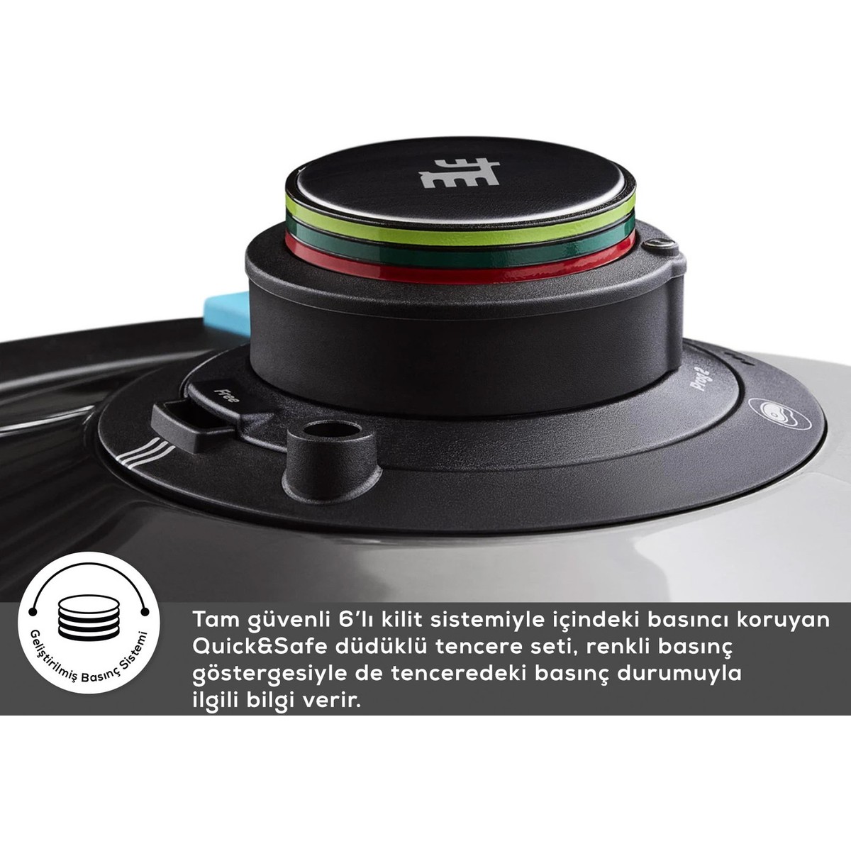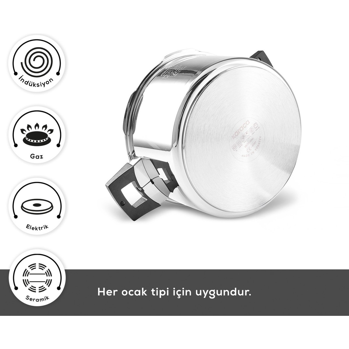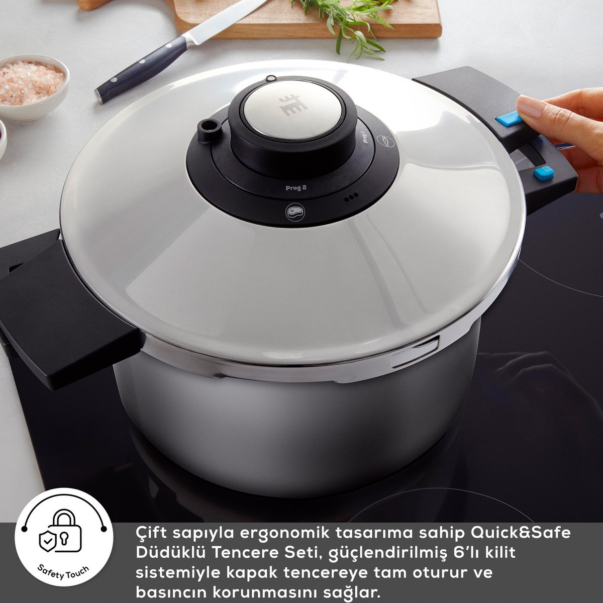 Karaca Quick & Safe Düdüklü Tencere Seti ile tüm lezzetler güvende! Tam güvenli 6’lı kilit sistemiyle tencere içindeki basıncı koruyan Karaca Quick&Safe düdüklü tencere seti, renkli basınç göstergesiyle de tenceredeki basınç durumuyla ilgili bilgi verir. Açık yeşil halka basıncın yükseldiğini, koyu yeşil halka ise pişirme seviyesine ulaşıldığını gösterir. 2 farklı programı sayesinde; çorba ve sebzeleri 1. Programda, et ve bakliyatları 2. Programda tam kıvamında pişirir. 6 ve 4 litre olarak iki ayrı tencereye sahip olan Quick&Safe Düdüklü Tencere Seti, uyumlu çift kapağa sahiptir. Kalınlığı %50 artırılmış, 1.5 mm kalın çelik gövde sayesinde yemekler daha uzun süre sıcak kalırken, tüm yemeklerin vitaminini, aromasını, mineral dengesini koruyup, yemeklerin lezzetini artırır. Üstelik indüksiyon dahil tüm ocaklarda kullanılabilir. Çift sapıyla ergonomik tasarıma sahip Karaca Quick&Safe Düdüklü Tencere Seti, diğer düdüklü tencerelere kıyasla daha az yer kaplayıp, aynı zamanda dengeli ve kolay bir tutuş sağlar.