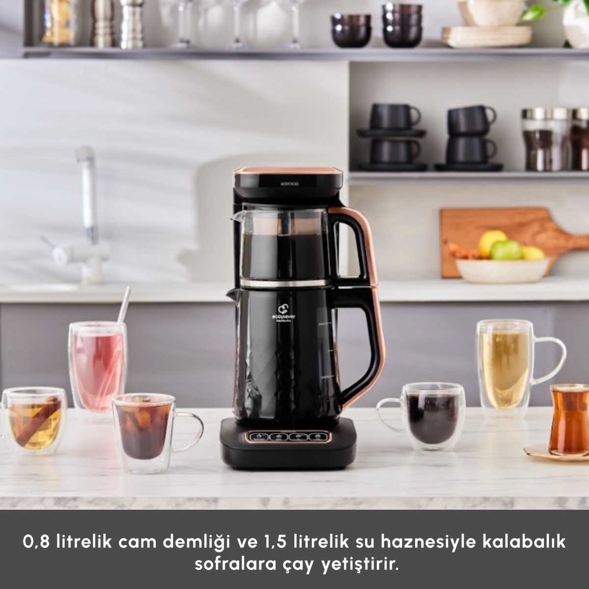 0,8 litre kapasiteli cam demliği ve 1,5 litre kapasiteli su haznesi sayesinde aileniz ve misafirlerinizle çayın keyfine varabilirsiniz.