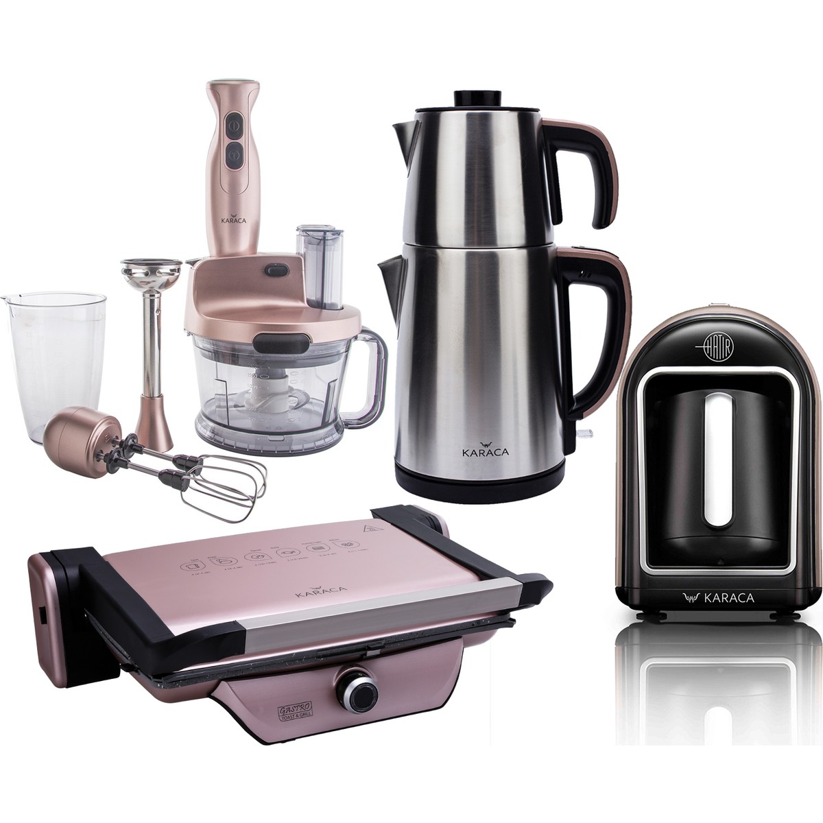 Pek çok küçük ev aletini bir arada sunan Karaca Smart Elektrikli Evlilik Paketi Rose Gold ile mutfakta ihtiyaç duyduğunuz tüm küçük ev aletlerini tek seferde satın alabilirsiniz. Evini yenilemek isteyenlerin de favorisi olacak paketin içerisinde mutfakta en çok kullanılan akıllı ve fonksiyonel cihazlar yer alır. Mutfağında renk uyumunu önemseyenler için hepsi aynı renkte tasarlanan elektrikli ev aletleri sayesinde mutfağınızda renk bütünlüğü sağlayabilir ve bu ürünleri bir mutfak takımının parçaları gibi kullanabilirsiniz. Her biri fonksiyonel özelliklere sahip mutfak aletlerinden oluşan paket içinde tost makinesi, mutfak robotu, çay makinesi ve Türk kahve makinesi olmak üzere toplam 4 tane elektrikli ev aleti yer alır.