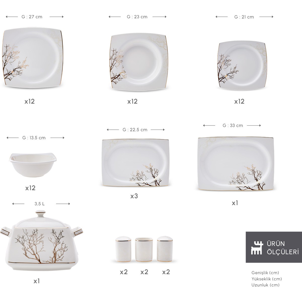 Karaca’nın ikonik tasarımları Square Bone Serisi ile sofralarınızda… Kare olarak tasarlanan zamansız form ve zarif tasarımlarla hem farklı hem de şık sofralar oluşturun. Square Bone, şıklığı ve zarafeti aynı anda barındırır. Kare formunu tamamlayan renkli-renksiz veya desenli-desensiz setleriyle farklı sofra sunumlarına uyum sağlar. Eşsiz şıklığa sahip tasarımların sofralarınızda oluşturduğu etkiyi yıllarca hissedin. Karaca Autumn Fine Cream 60 Parça 12 Kişilik Porselen Yemek Takımı Kare Set İçeriği 12 Adet 23 cm Yemek Tabağı; 12 Adet 27 cm Servis Tabağı; 12 Adet 21 cm Pasta Tabağı; 12 Adet 13,5 cm Kase ; 3 Adet 22,5 cm Küçük Kayık Tabak ; 1 Adet 33 cm Büyük Kayık Tabak ; 2 Adet 6 cm Tuzluk; 2 Adet 6 cm Biberlik ; 2 Adet 6 cm Kürdanlık; 1+1 Adet 3,5 L Çorbalık ve Kapağı; Malzeme: Porselen Elde yıkanması tavsiye edilir.