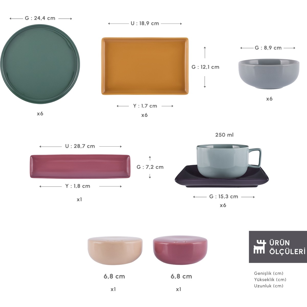 - 6 adet pasta tabak : 24.5 x 24.4 x 2.1 cm (Uzunluk x Genişlik x Yükseklik)