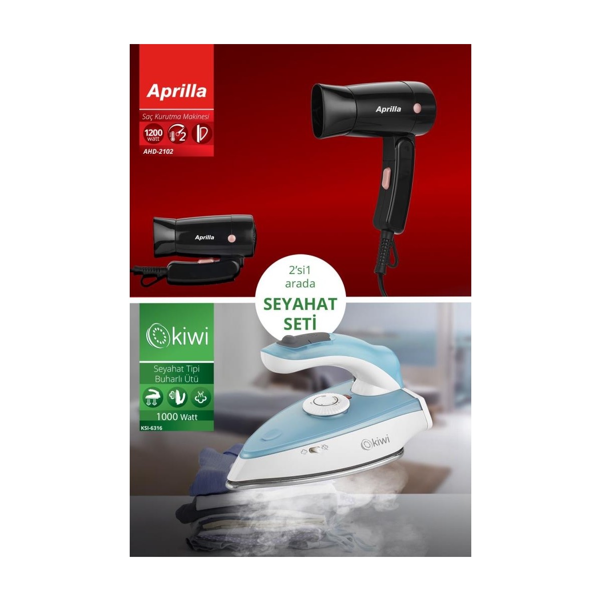 Kiwi Kats-12 2’si 1 Arada Katlanabilir Ütü ve Saç Kurutma Makinesi Dahil Seyahat Seti