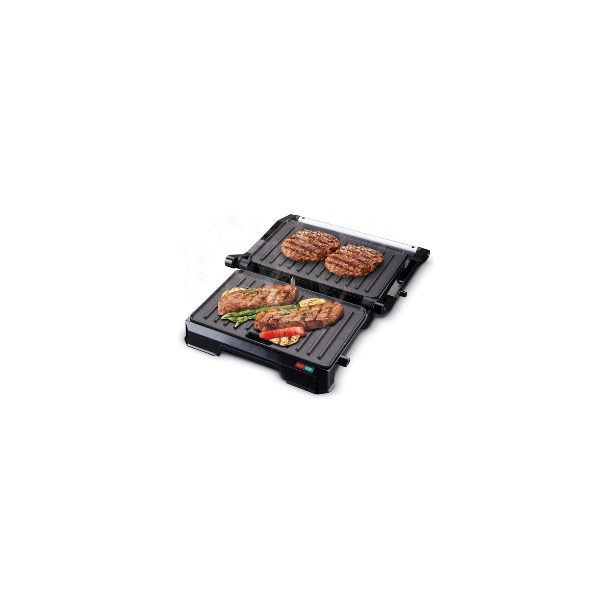 - 180 derece açılabilme özelliği: Izgara modunda tamamen açılarak geniş bir pişirme yüzeyi oluşturur, böylece et, sebze ve sandviçlerinizi rahatça pişirebilirsiniz.