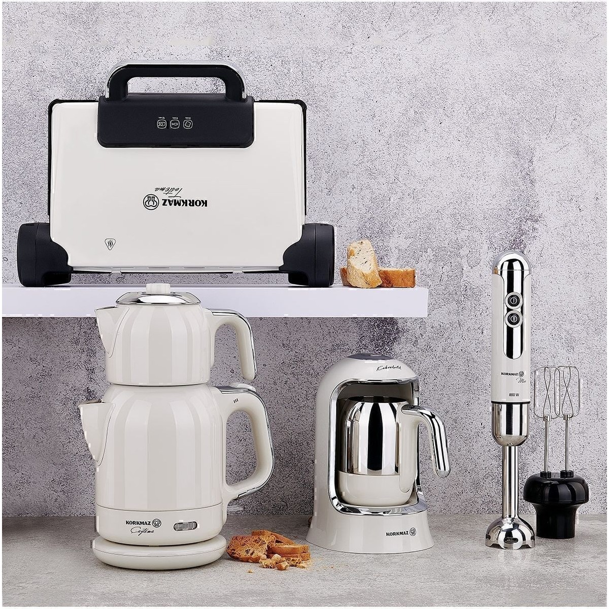 Öncelikle ürün çok şık ve kaliteli yıllar geçse de renginden modelinden sıkılmayacağım bir ürün…sadece olumsuz olarak çaycı bir tık ses çıkarıyor ısınırken suyu onun dışında hepsini denedim ve gayet memnun kaldım tost makinesinin yanında 2 tane yag akarsa diye haznesi var cok hos bir detay birde kahve makinesi çok güzel yapıyor acıtmıyor yoğun yapmama rağmen…alacaklara fikir olsun:)