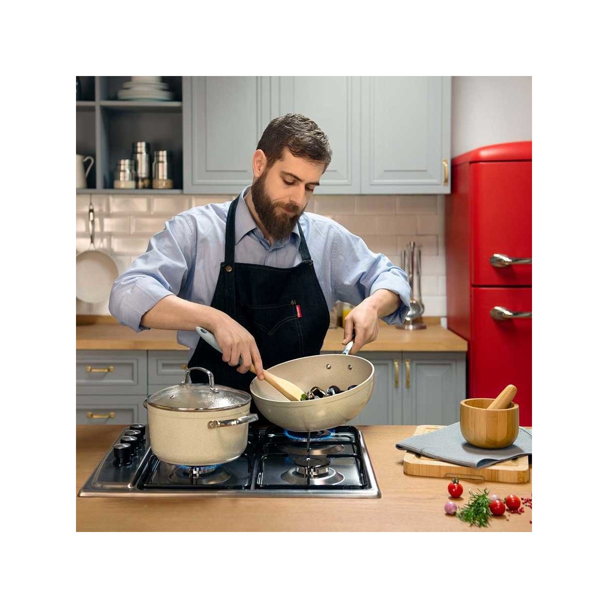 Geri dönüşümlü, tamamen doğal malzemeden, çevre dostu teknoloji ile üretilen Granita çizilmeye karşı ekstra dirençli volkanit görünümlü PTFE kaplama ve yüksek ısıya dayanıklı silikon dış kaplama ile çok az yağ kullanarak lezzetli yemekler yapar.
