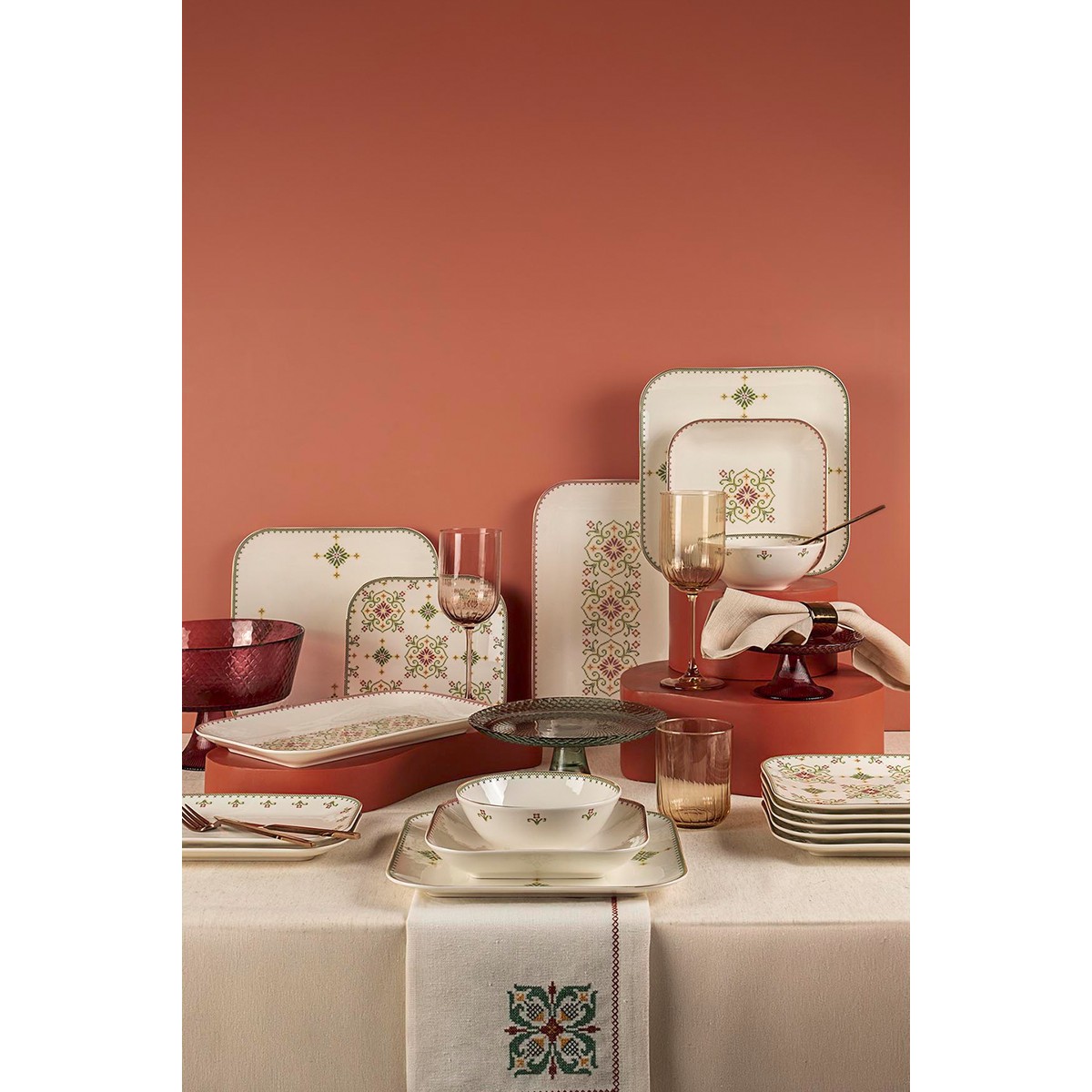 “Çeyiz sandıklarının vazgeçilmezleri olan kanaviçe ve etaminler, nesilden nesile aktarılan ve kültür tarihimize derinlemesine işlemiş el sanatlarıdır. Bu değerli işlemeler, evlerimizi süslerken aynı zamanda kültürleri ve kuşakları birbirine bağlayan bir köprü görevi görürler. Bu geleneksel çalışmaların izlerini taşıyan Goblen Yemek Takımı şimdi sofralarınızı süslüyor. Geçmişten gelen sanatı modern yaşamla buluşturan Goblen Yemek Takımı, sofralarınıza sıcaklık ve geleneksel dokunuşlar katıyor.