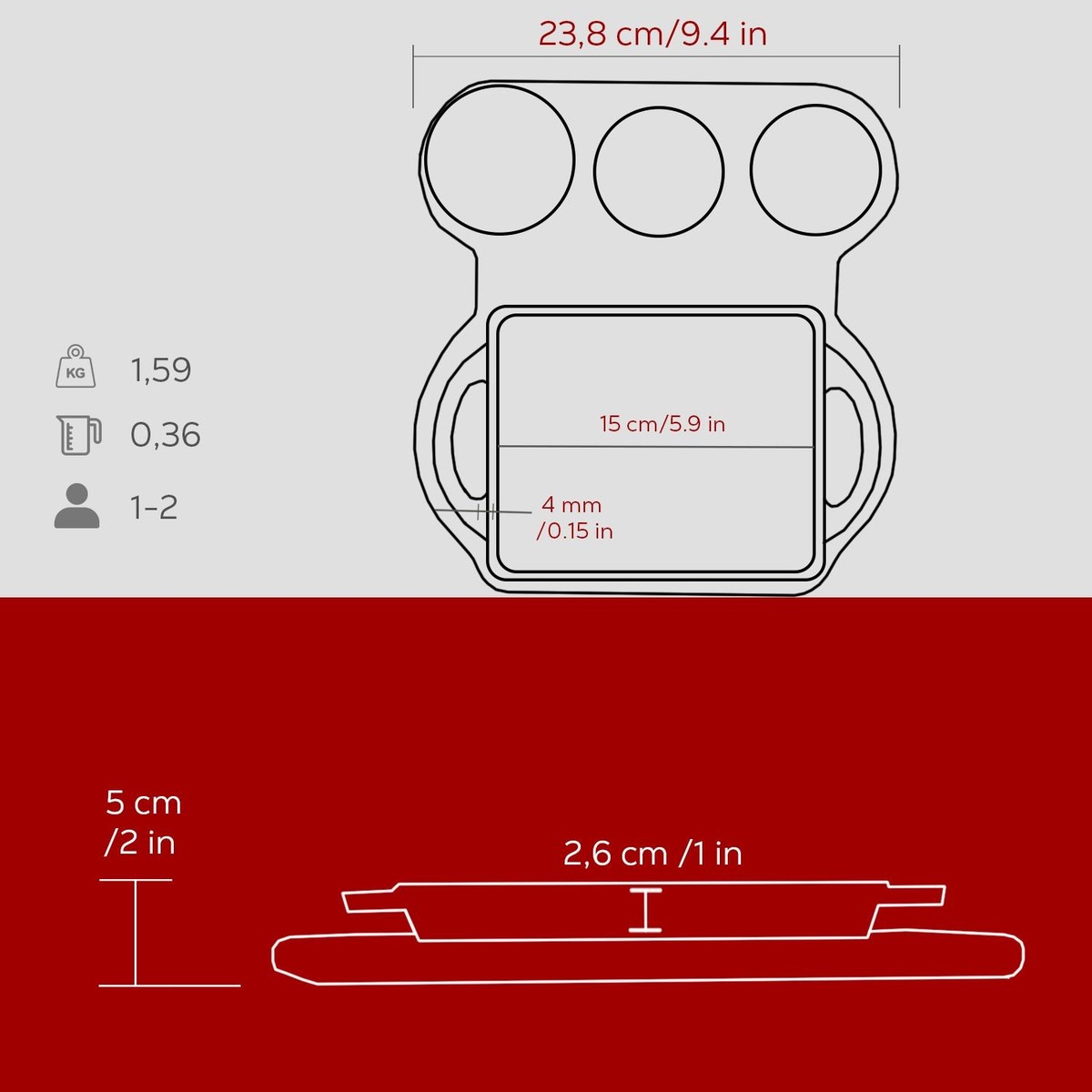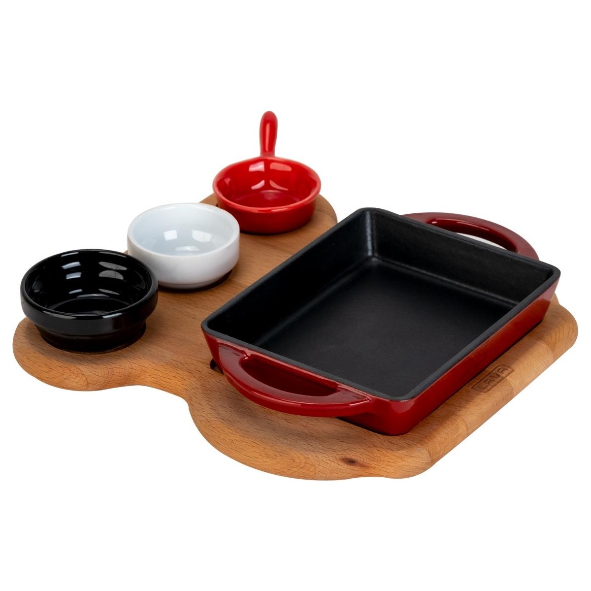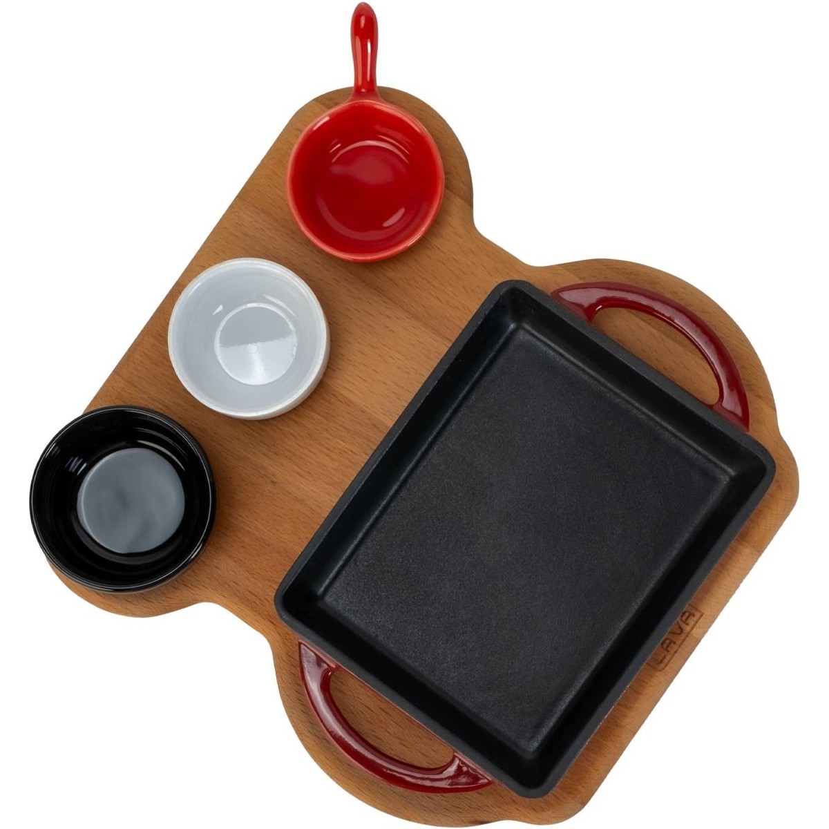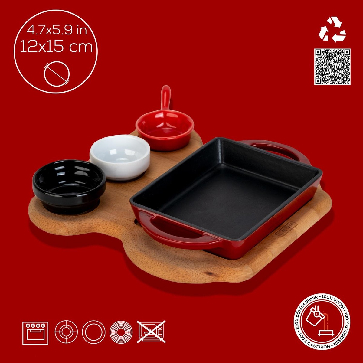 Lava Döküm Dikdörtgen Sahan Döküm Demir Yekpare Çift Kulplu Kayın Servis Ahşabı Ölçü 12X15CM. (Sos Kapları Dahil Değildir.)-Bordo