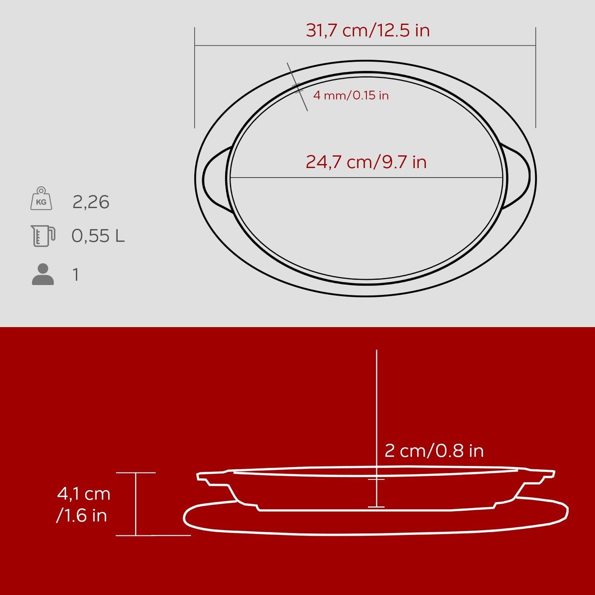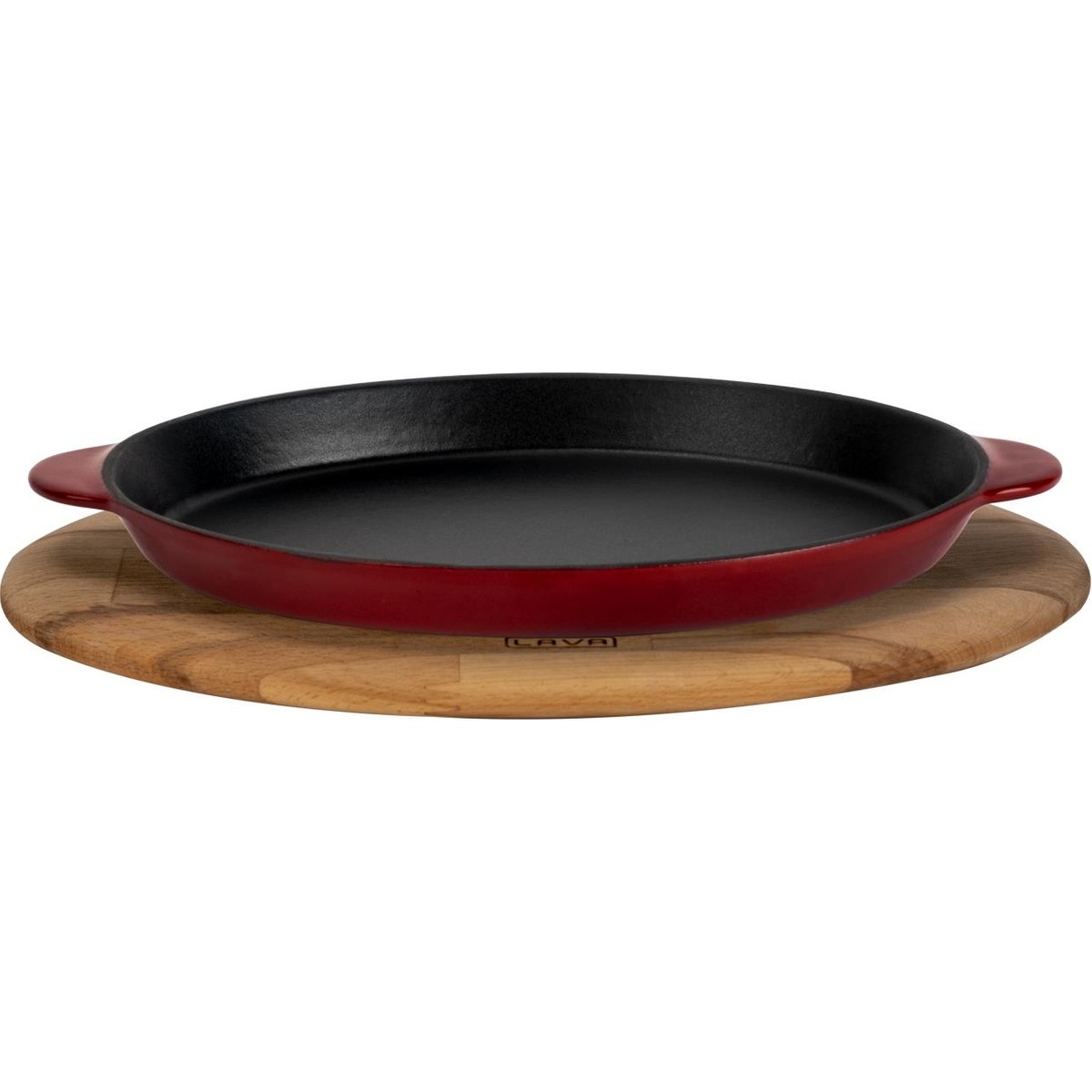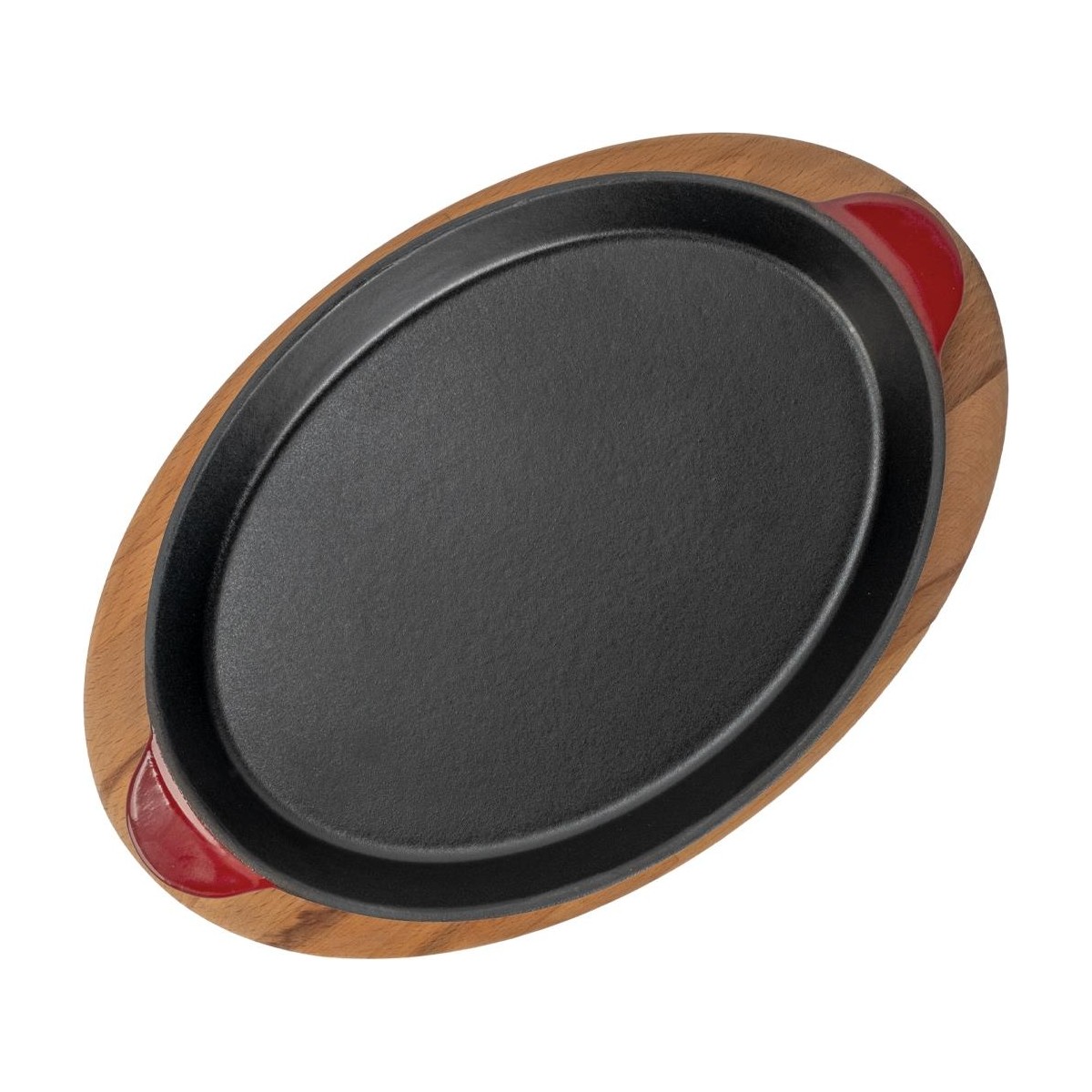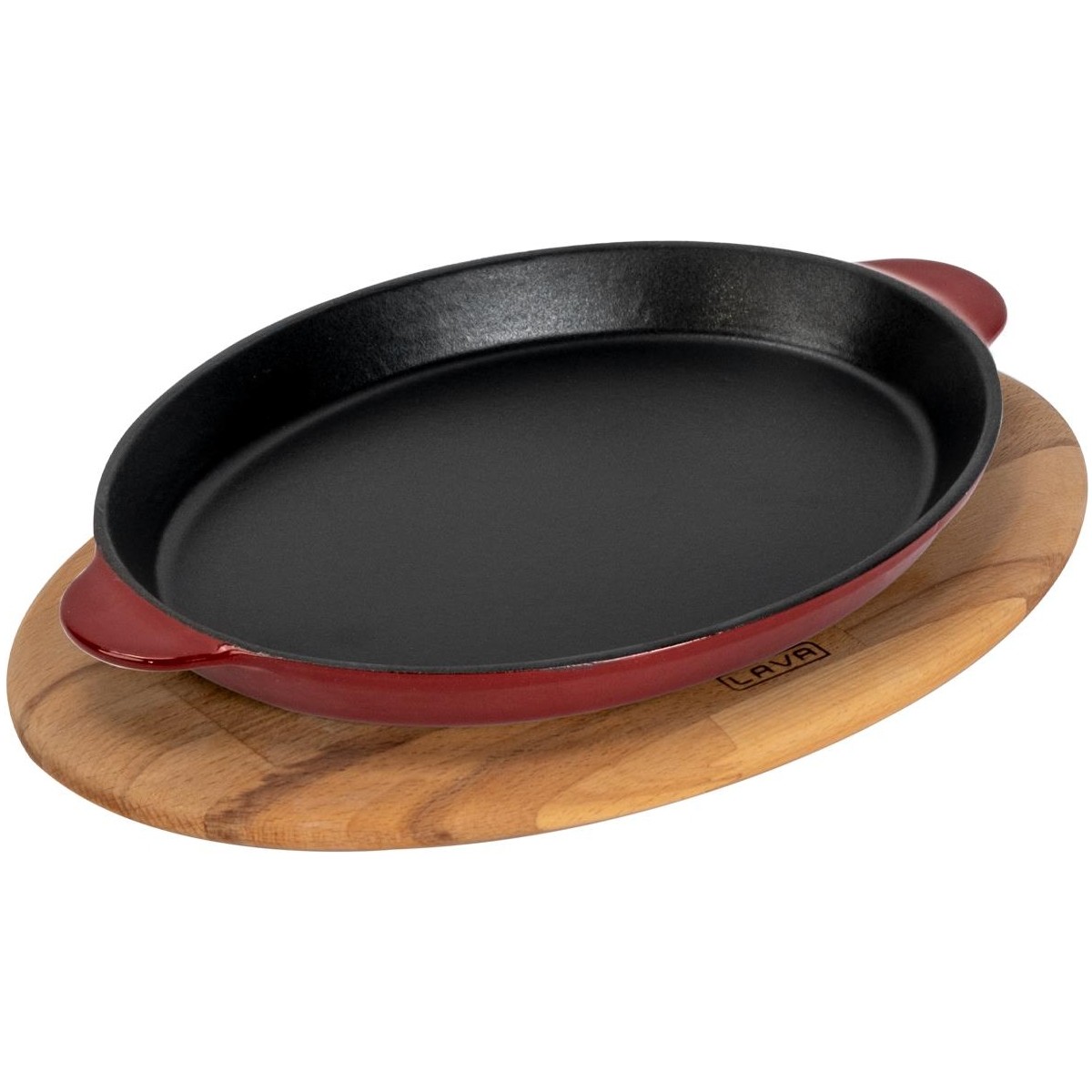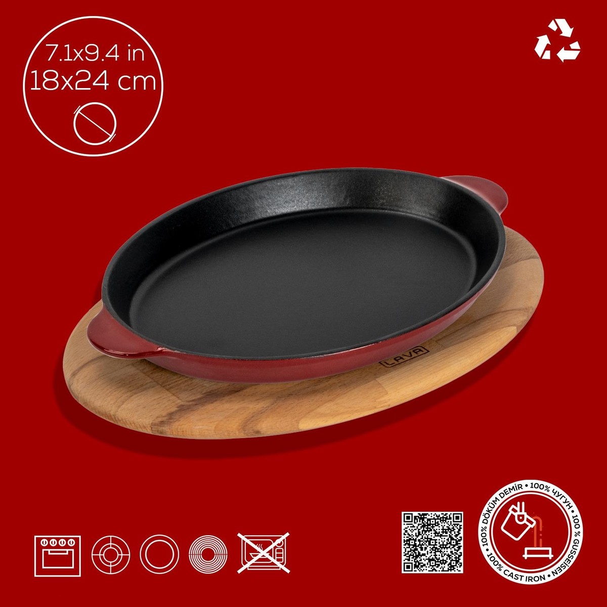 Lava Döküm Oval Fajita Tabağı Döküm Demir Yekpare Çift Kulplu Kayın Servis Ahşabı Ölçü 18X24CM.-BORDO