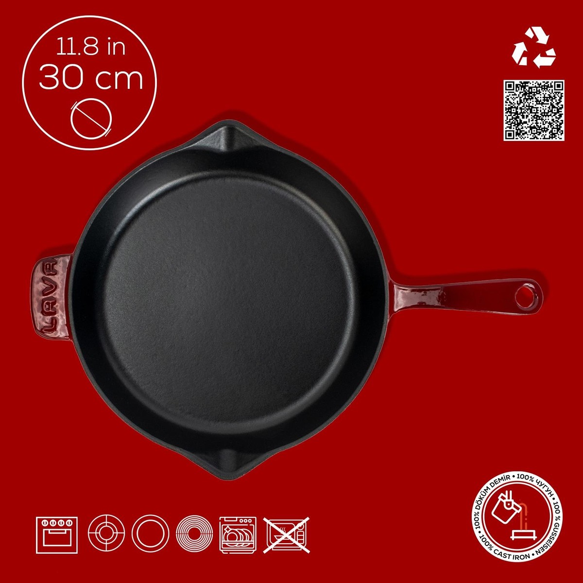 Lava Döküm Yuvarlak Kızartma Tavası Döküm Demir Yekpare Saplı. ÇAP(Ø)30CM-BORDO
