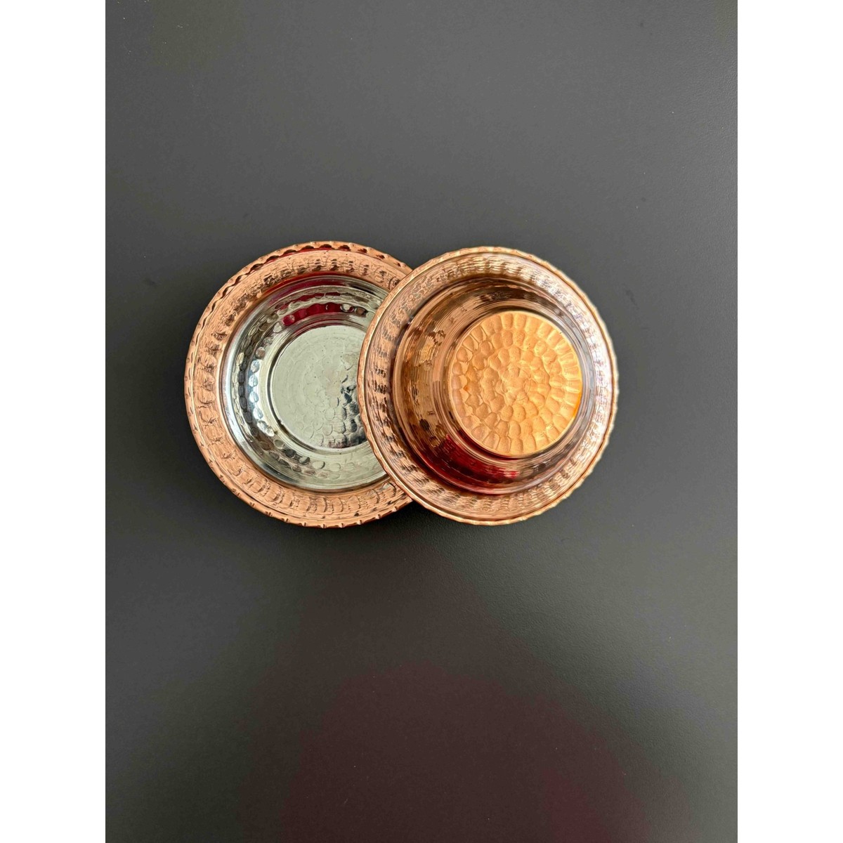 El Yapımı Bakır Çerezlik Kahvaltılık Sunumluk – 12.5 cm x 2.5 cm Şık ve zarif tasarımıyla sofralarınıza otantik bir hava katan el yapımı bakır çerezlik, tamamen ustaların el işçiliğiyle çekiç dövme tekniği kullanılarak üretilmiştir.; Ölçüler: 12.5 cm genişlik x 2.5 cm yükseklik Malzeme: Bakır, iç yüzeyi kalay kaplama İşçilik: El yapımı, geleneksel çekiç dövme tekniği Kullanım Alanları: Çerez, kuruyemiş, lokum, kahvaltılık sunumlarıDayanıklı yapısı sayesinde uzun yıllar kullanılabilir.; El işçiliği dokusu ile her biri kendine özgü bir görünüme sahip olan bu çerezlik, sofralarınızı sadece işlevsel değil aynı zamanda estetik bir şekilde de tamamlar.; Misafir ağırlamalarında, kahve yanına ikramlarda ve günlük kullanımlarda şıklık arayanlar için ideal bir üründür.