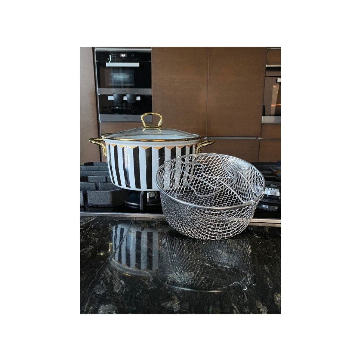 Le murano Leydi kızartma tenceresi ile yemeklerinize lezzet katın! Ürün içeriği:1 adet emaye tencere,1adet tencere kapağı,1 adet kızarma teli Malzeme:Emaye Üretim yeri:Türkiye Ölçü:22 cm Renk:Siyah beyaz