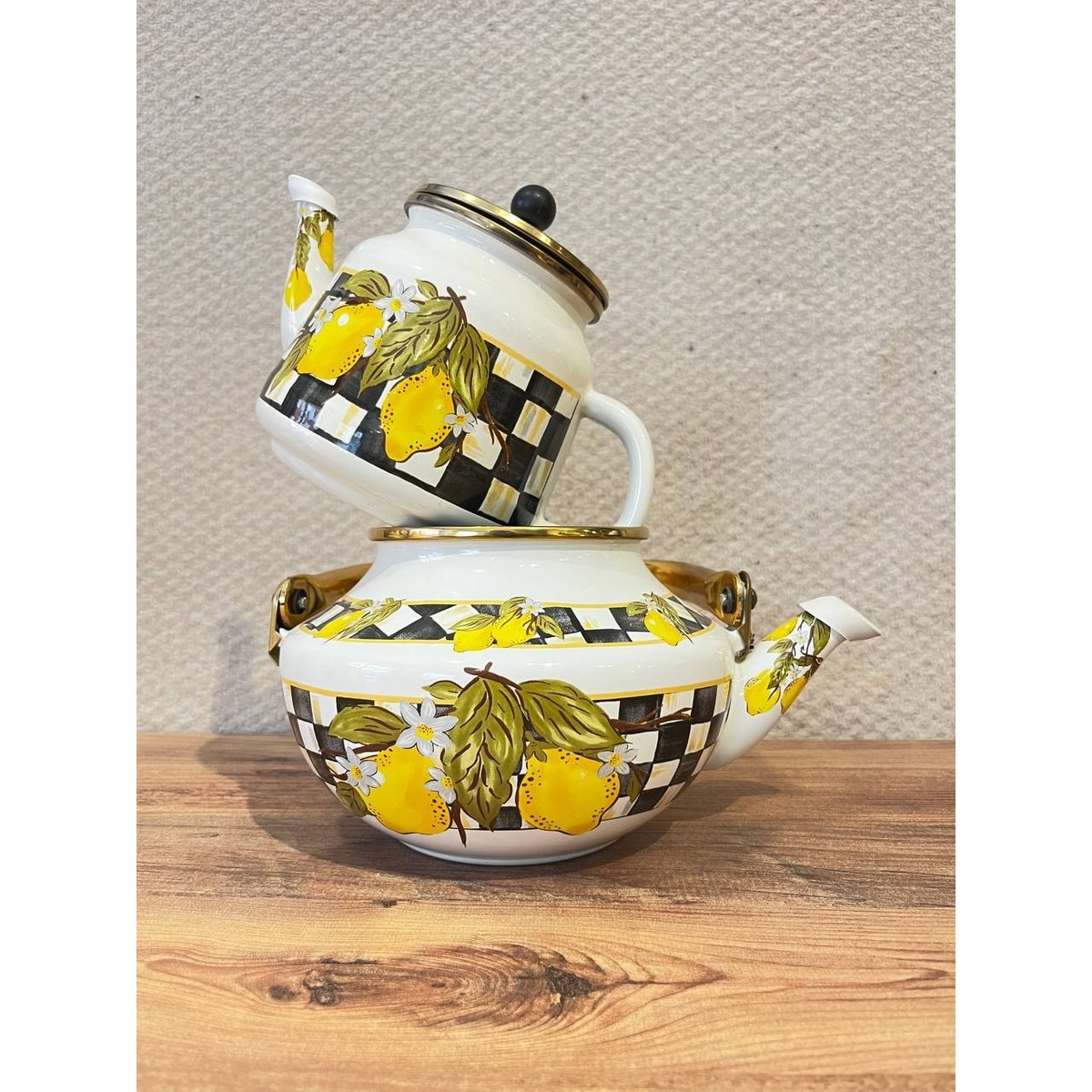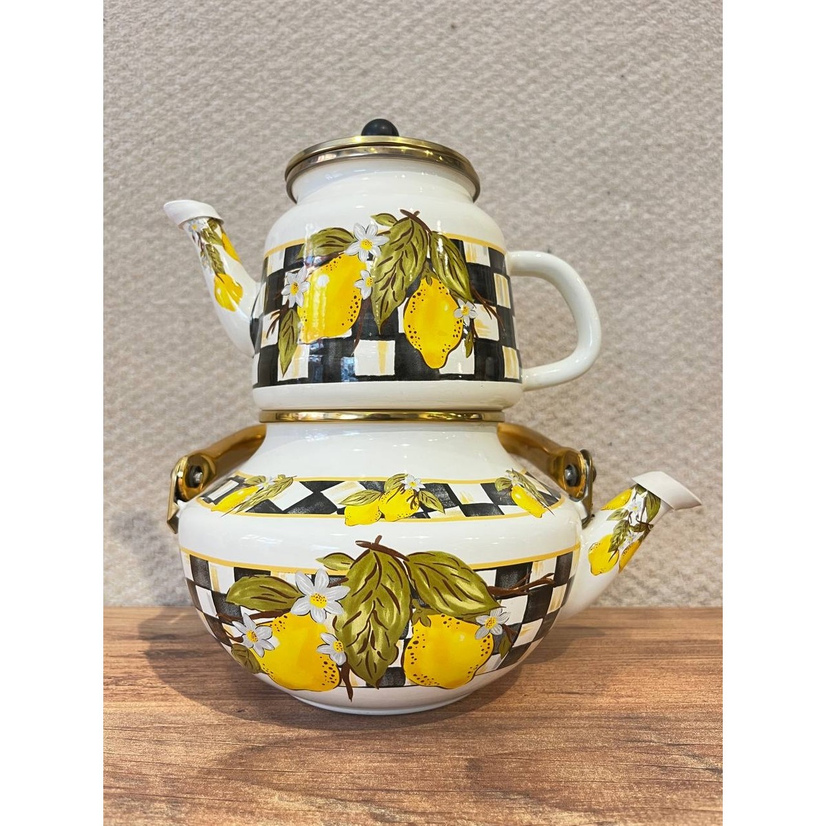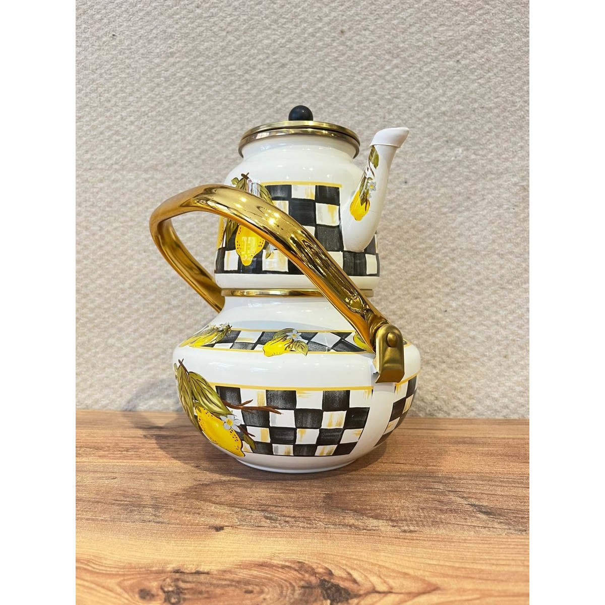 Canlı limon desenleri ve dikkat çekici siyah-beyaz dama detayıyla tasarlanmış bu çift katlı çaydanlık takımı, mutfağınıza hem renk hem de şıklık katıyor. Üst kısmı 1000 ml hacmindeki emaye demliğiyle çayın aromasını korurken, 2400 ml kapasiteli emaye alt kısmı ile kalabalık misafirlerinize yetecek kadar çay hazırlamanızı sağlar.