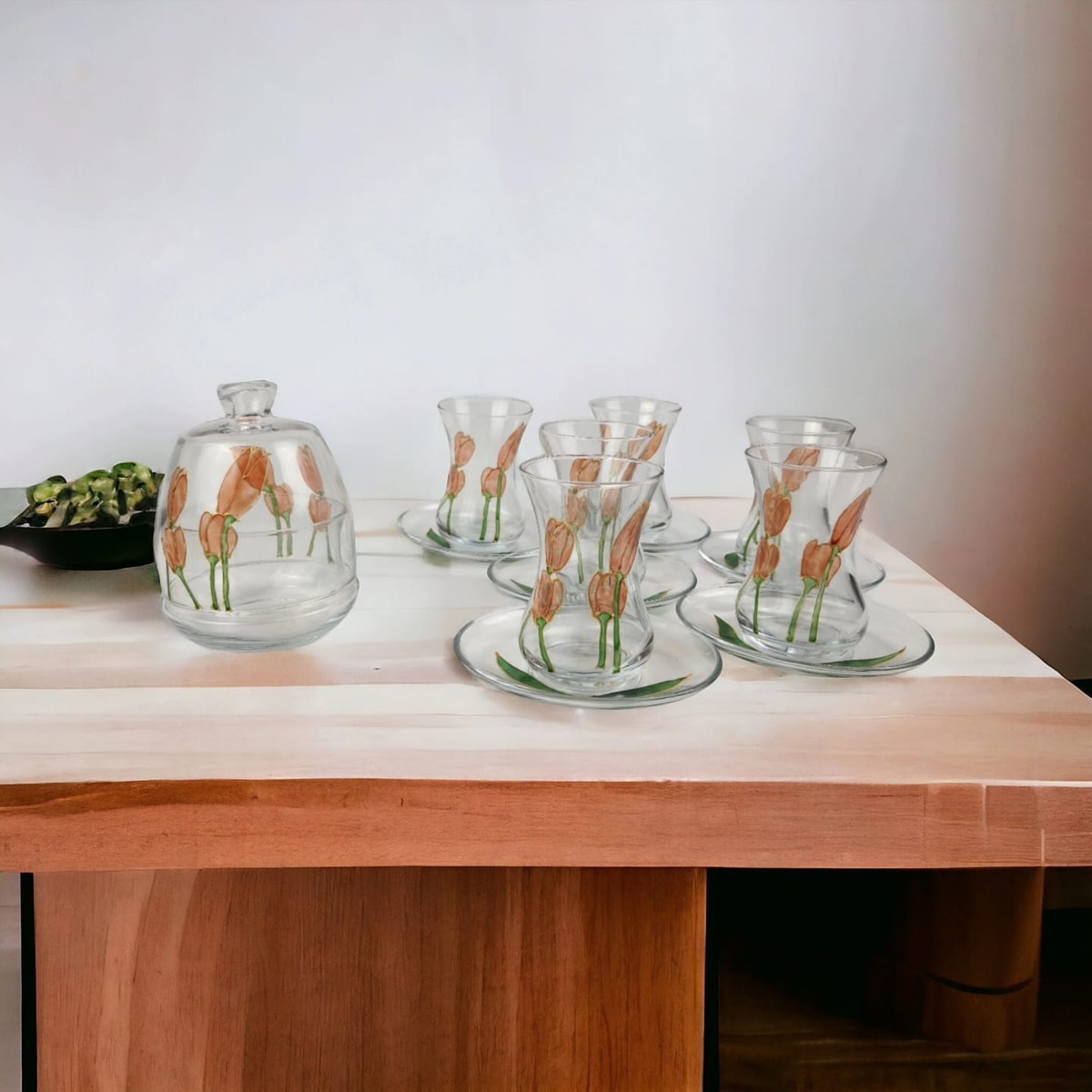 Lotus Dekor El Boyalı Cam Desenli Çay Seti : 6 Bardak Tabaklar + Şekerlik Hediye