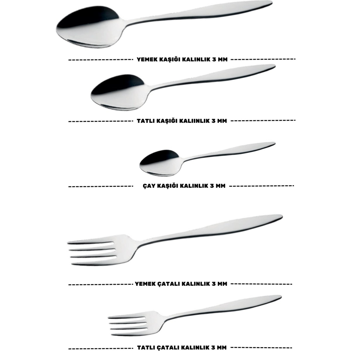 Lugga Ceyda Yemek – Tatlı Çatal Kaşık ve Çay Kaşık Takımı 12 Kişilik 60 Parça TAKIM İÇERİĞİ; 12 Adet Yemek Kaşığı 3mm, 12 Adet Yemek Çatalı 3mm, 12 Adet Tatlı Kaşığı 3mm, 12 Adet Tatlı Çatalı 3mm, 12 Adet Çay Kaşığı 3mm Ürünlerimiz 18/10 paslanmaz çelikten üretilmiştir. Bulaşık makinesinde yıkanması uygundur.