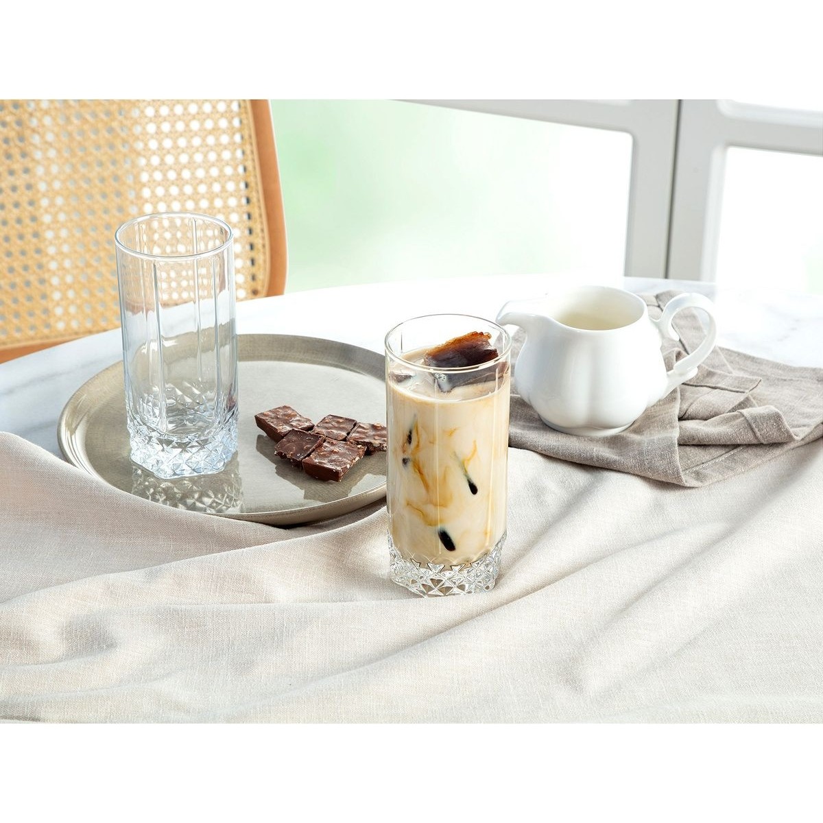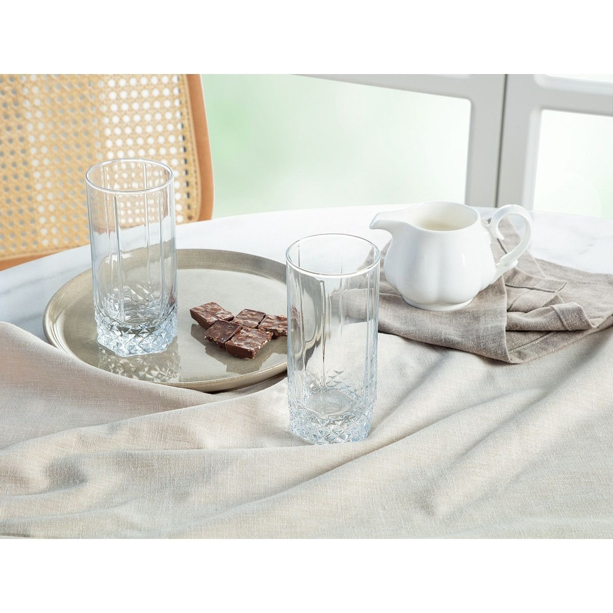 Pamella 4-lü Su Bardağı Seti, sade tasarımına hareket katan dokusuyla modern ve klasik tarzı birleştirerek, sunum zarafetini sofralarınıza taşıyor.
