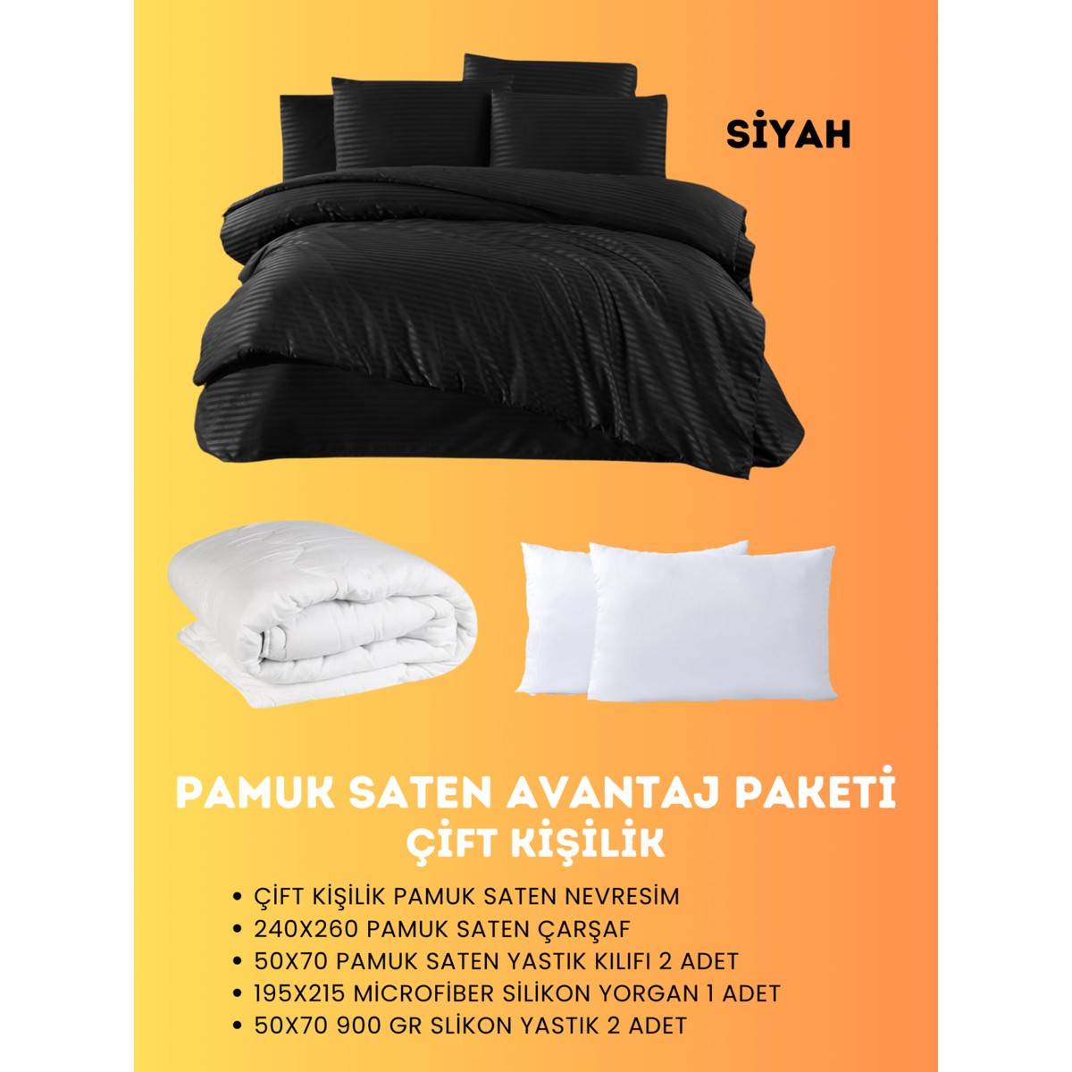 Çift Kişilik Pamuk Saten Nevresim;240×260 pamuk saten çarşaf;50×70 pamuk saten yastık kılıfı 2 adet;195×215 microfiber silikon yorgan 1 adet;50×70 900 gr slikon yastık 2 adet