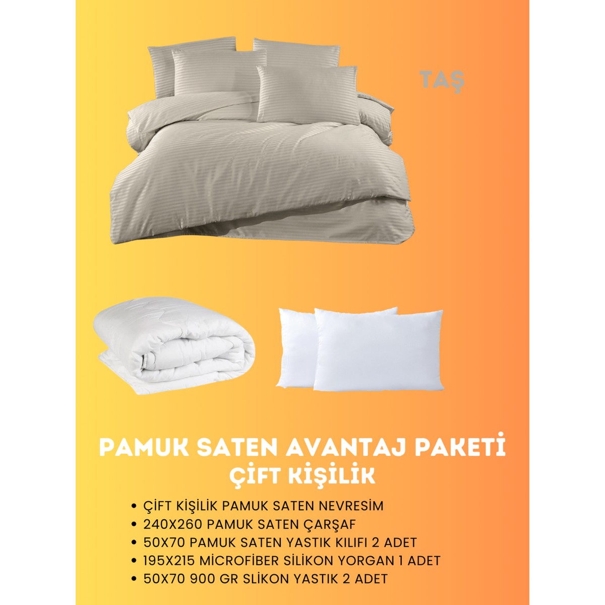 Çift Kişilik Pamuk Saten Nevresim;240×260 pamuk saten çarşaf;50×70 pamuk saten yastık kılıfı 2 adet;195×215 microfiber silikon yorgan 1 adet;50×70 900 gr slikon yastık 2 adet