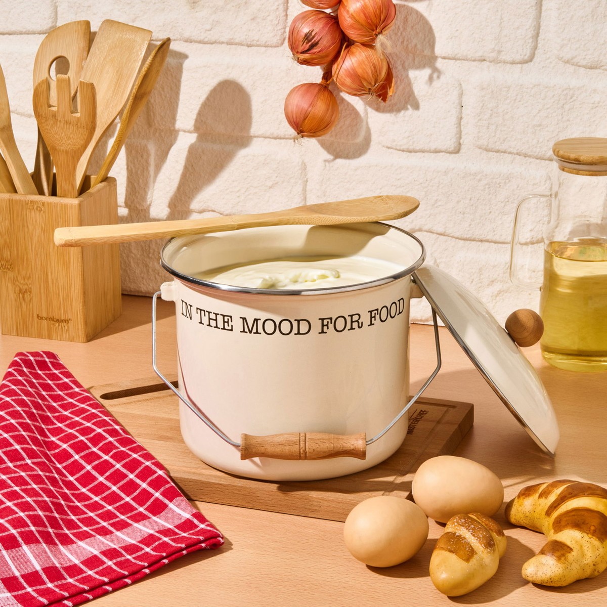 Ürün BilgileriÜrün ÖzellikleriMalzeme/Materyal: EmayeÖlçü: 20×20 cmRenk: KremMenşei: Çin Halk CumhuriyetiMien Emaye Büyük Bakraç, mutfaklarınıza nostaljik bir hava katıyor. Dayanıklı emaye kaplaması ve geniş hacmi sayesinde mutfakta vazgeçilmez bir yardımcı haline geliyor.Büyük hacmi sayesinde çok amaçlı kullanım imkanı sunar. Süt, yoğurt, su gibi gıdaların saklanması ve taşınması için idealdir.Geleneksel bakraç tasarımının modern çizgileriyle, mutfak dekorasyonunuza zarif bir dokunuş katar. Klasik görünümüyle her mutfağa uyum sağlar.Kullanım ve Bakım Önerileri• Ürün ilk kullanımdan önce hafif deterjan ile yıkanmalıdır.• Bulaşık makinesinde yıkanması uygun değildir.