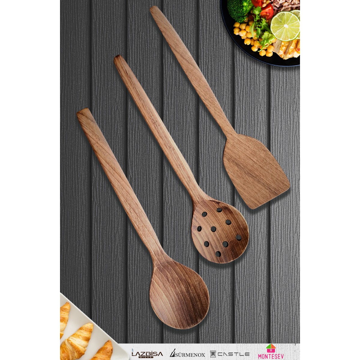 Doğal Ceviz Ağacı Ahşap Tahta Kaşık Spatula Seti Ağaç Kaşık (3 Lü Set) Mnt6