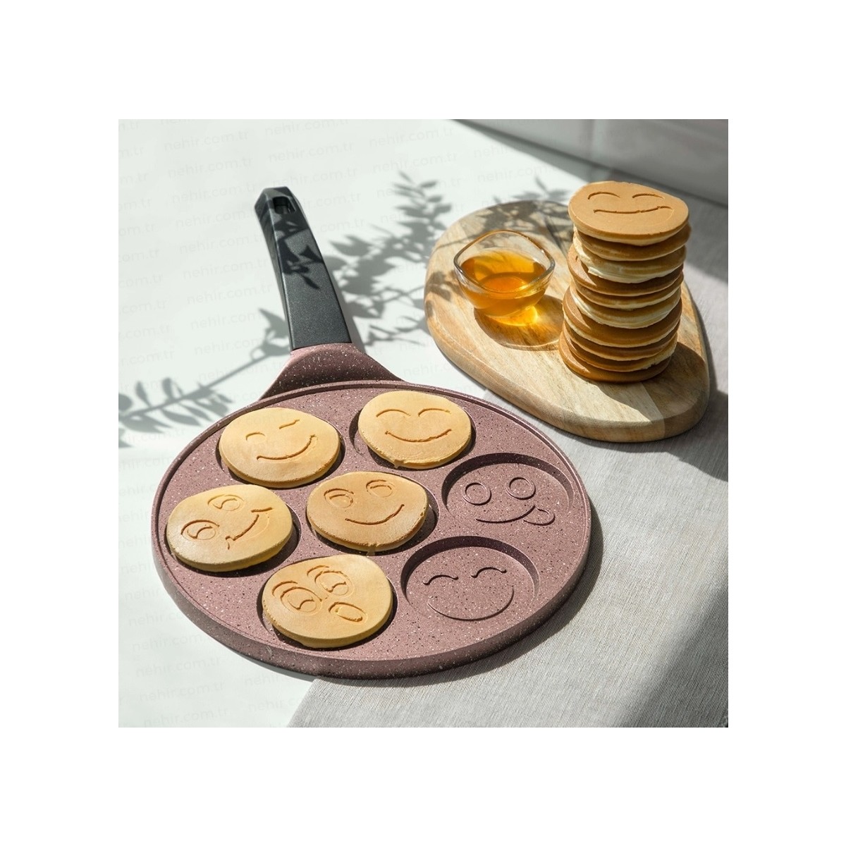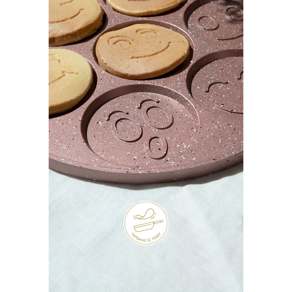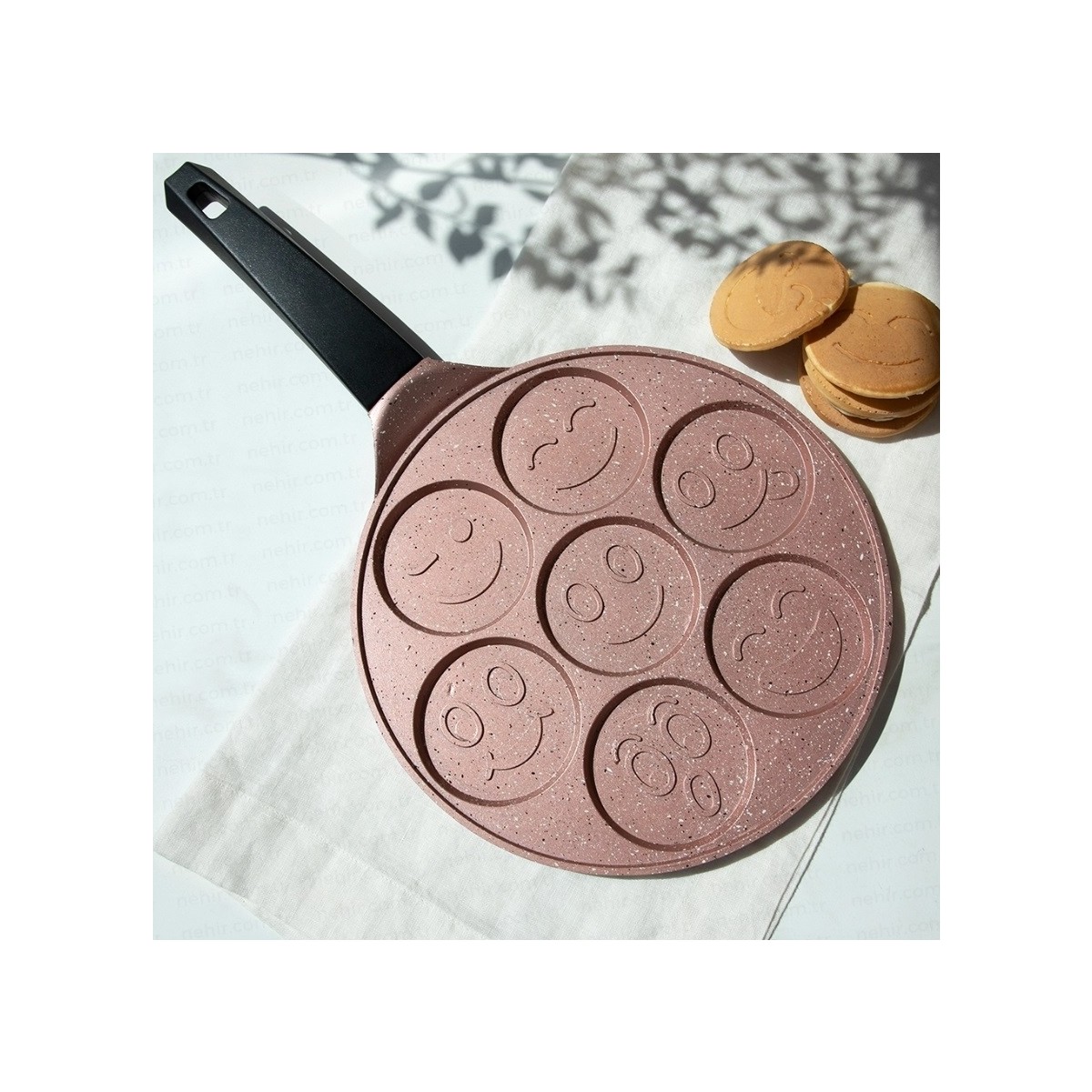 Nehir Rose Gold Alüminyum Döküm 27 cm Krep Tavasıeğlenceli pankekler ve pratik kahvaltılar için ideal bir yardımcı. Yapışmaz döküm yüzeyi sayesinde kolay pişirme ve temizlik sunar, gülümseten tasarımıyla sofralara neşe katar.