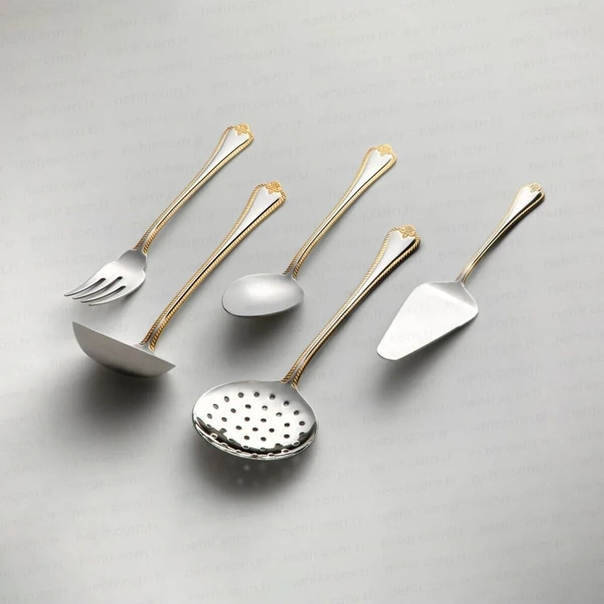 Nehir Fulya Altın Saten Servis Takımı Seti 5 Parça Kepçe Kaşık Kevgir Seti