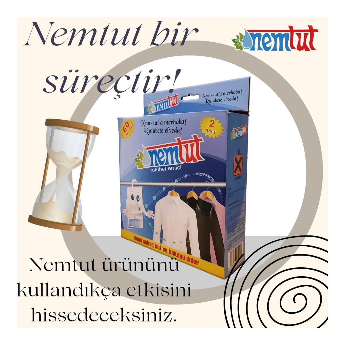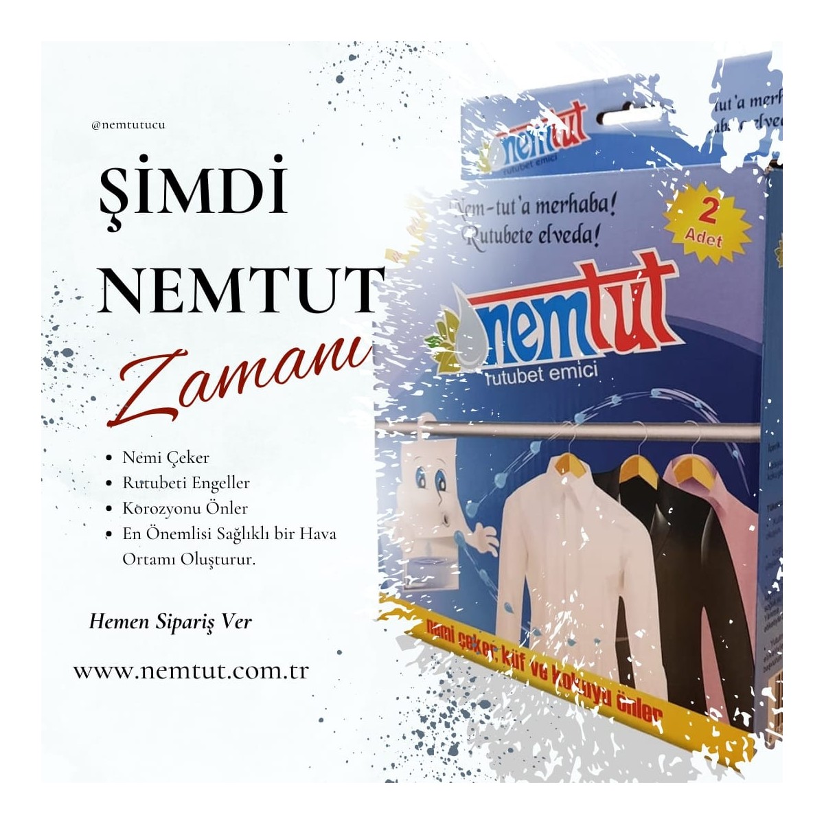 Rutubet Ve Nem Karşı Etkili Koku Küf Ve Korozyon Önleyici 1 Kutu 2 Paket 1 Kg NEM TUT, kapalı alanlarda aşırı nemin neden olduğu küf ve kötü kokuyu engellemek için özel olarak dizayn edilmiştir. Özel ambalajı sayesinde ön yüzeyinden su buharını çeker ve özel içeriği sayesinde sıvılaştırarak alt haznede biriktirir. Askılı tasarımı sayesinde elbise dolaplarınızda, banyolarınızda, çamaşırhanelerinizde, depolarınızda, bodrumlarınızda ve garajlarınızda pratik olarak kullanılabilir. Havada bulunan nemi iki hafta boyunca kendi bünyesinde, sonrasında ise altında bulunan torbasında biriktirir, nemin torbaya doluşu kolayca gözlenebilir. Uygulandığı ortamın rutubet durumuna göre ürünün ortalama ömrü 60 gündür. 1 kutu Nem-Tut paketi içerisinde polietilen ambalajlar içerisinde iki adet Nemtut ürünü çıkmaktadır. Kullanım Alanları · Ev, · Garaj ve dolap, · İşyerleri, · Banyo, · Çamaşırhane, · Kilerler, · Otomobil, · Tekne, gibi birçok farklı alanlarda kullanarak rutubeti ve rutubetin meydana getireceği zararları pratik olarak ortadan kaldırabilirsiniz. Kullanma Talimati · Kutudan çıkardığınız Nem-Tut paketinin koruyucu polietilen kılıfını açın. · Nemtut paketini uygulamak istediğiniz bölgede uygun bir yere asın. · Paket içeriği tamamen bittiğinde yenisi ile değiştirin. · Bitmiş Nemtut paketini çöpe atın. · Ellerinizi su ile yıkayın. Üründen maksimum fayda sağlamanız için ürünü bulunduğu ortam da mümkün olduğunca yüksek bir yere koyun. Nemtut sürekli kullanımda sizlere daha çok fayda ve etki sağlayacağını unutmayın.