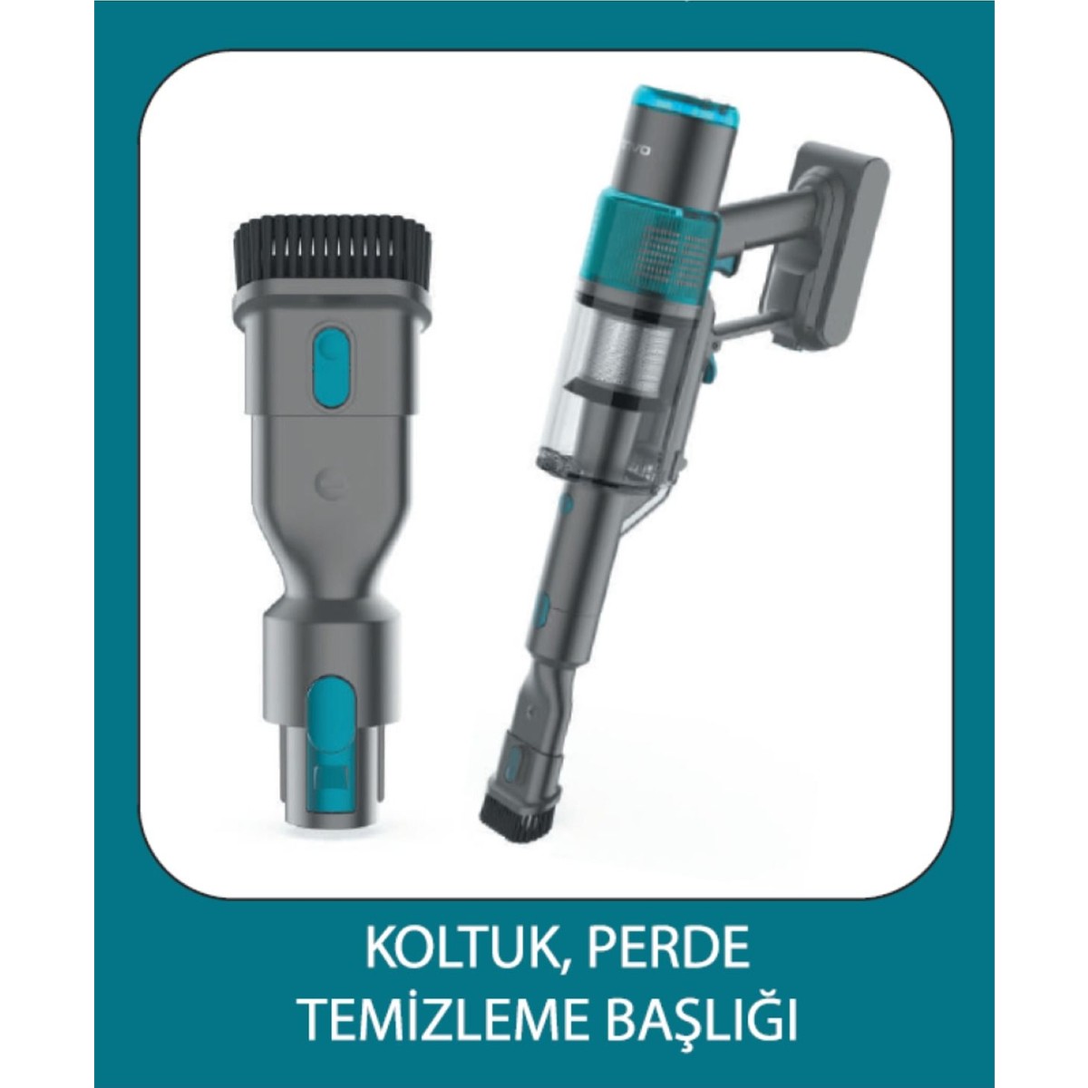Onvo OVDSS03 Kablosuz Şarjlı Dikey Süpürge 500W — koltuk ve perde temizleme başlığı ile evinizdeki ulaşılması zor alanlarda bile etkili temizlik sağlar. Güçlü motoru ve pratik başlıkları sayesinde, temizlik artık daha hızlı ve zahmetsiz.