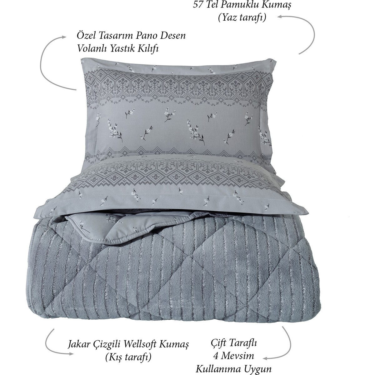 Set İçeriği ; 155x215cm Yumuşacık Jakarlı Wellsoft Yorgan (Tek Kişilik) + 100×200+35cm Lastikli Çarşaf + 50×70+5cm Volanlı Yastık Kılıfı (1 Adet).