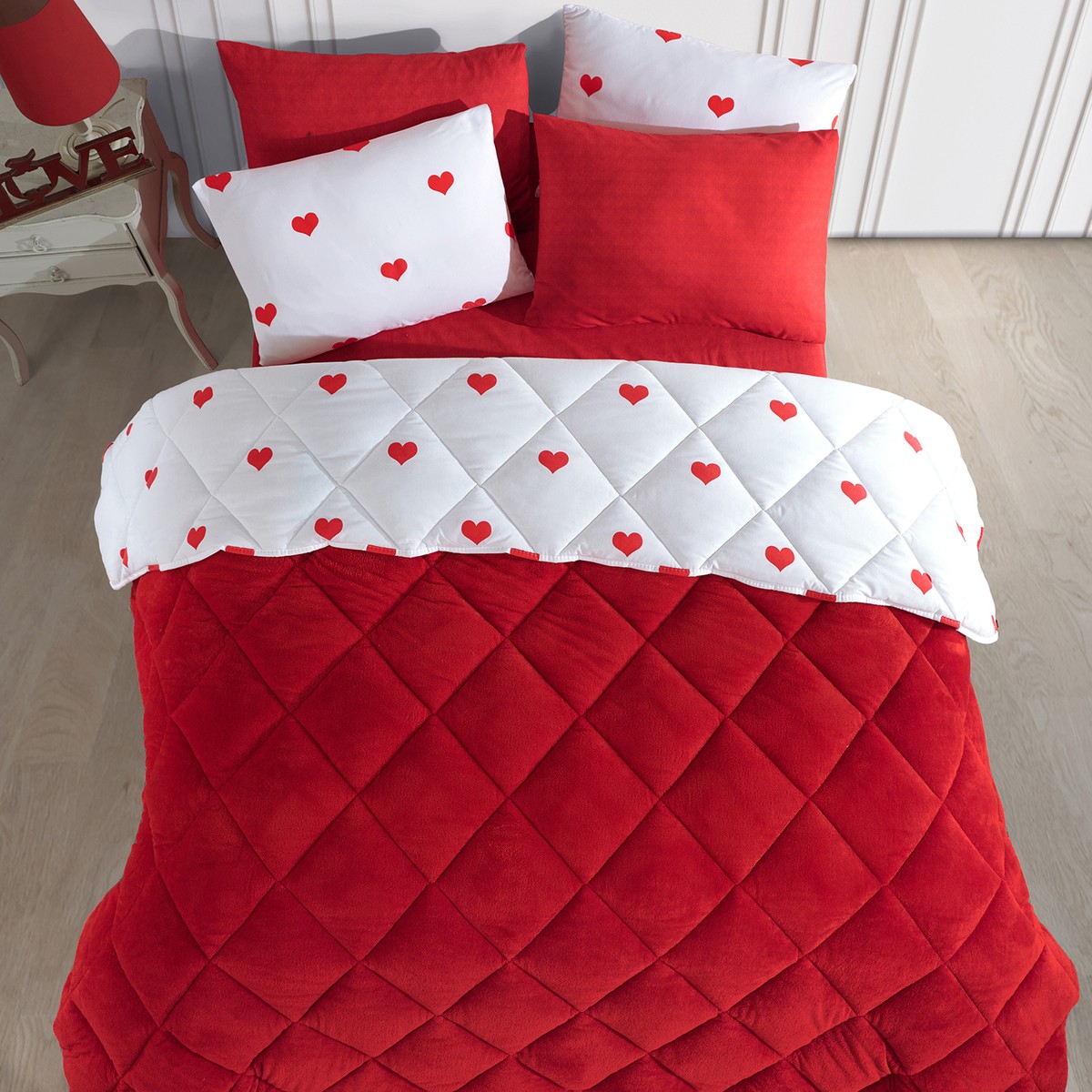 Sade ve şık görünümüyle dikkat çeken kalpli desen, her yatak odasına kolayca uyum sağlar.