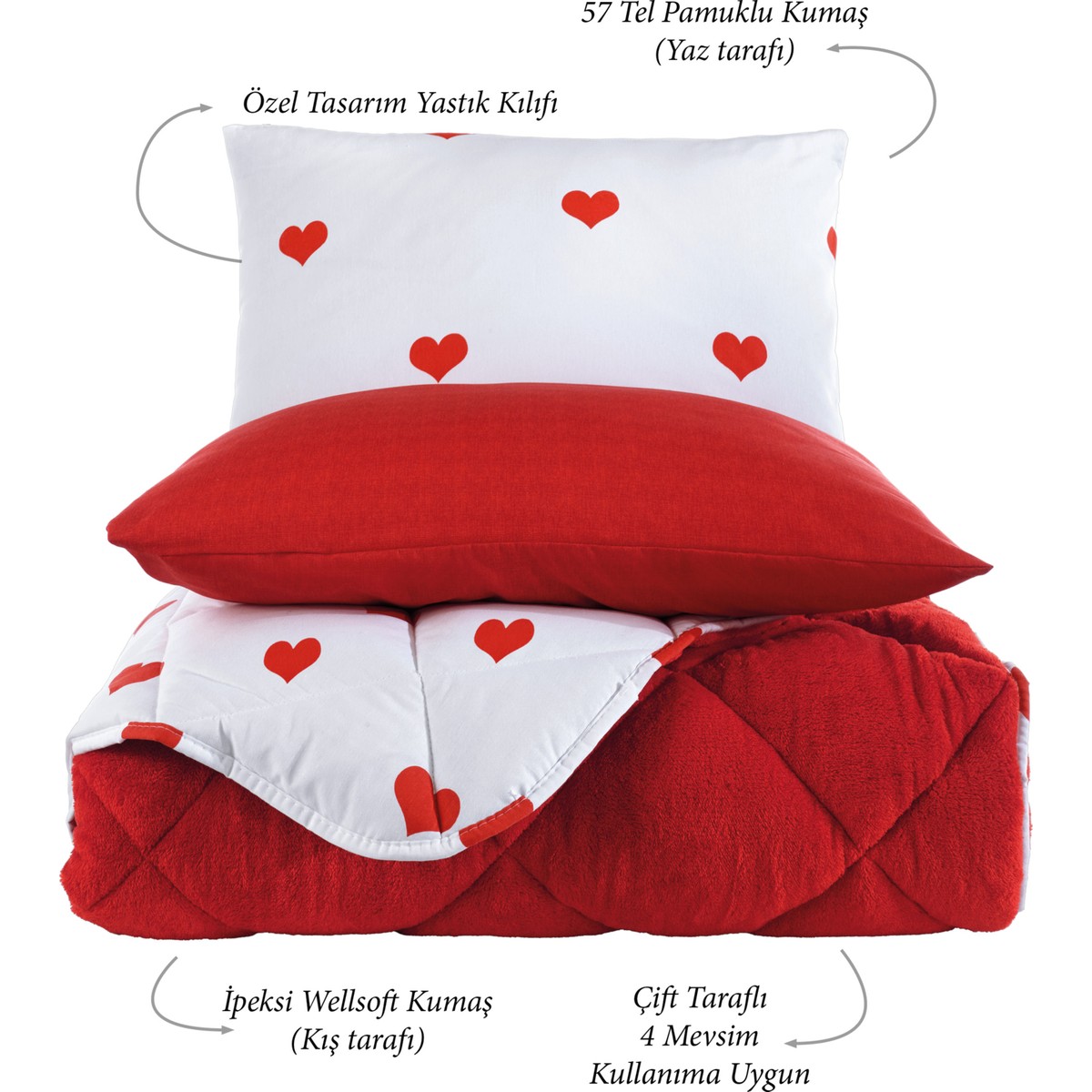 Ürün içeriği : 155x215cm Yumuşacık Wellsoft Yorgan + 100×200+35cm Lastikli Çarşaf + 2 adet 50x70cm yastık kılıfı (1 adet kalpli yastık kılıfı – 1 adet kırmızı yastık kılıfı.)