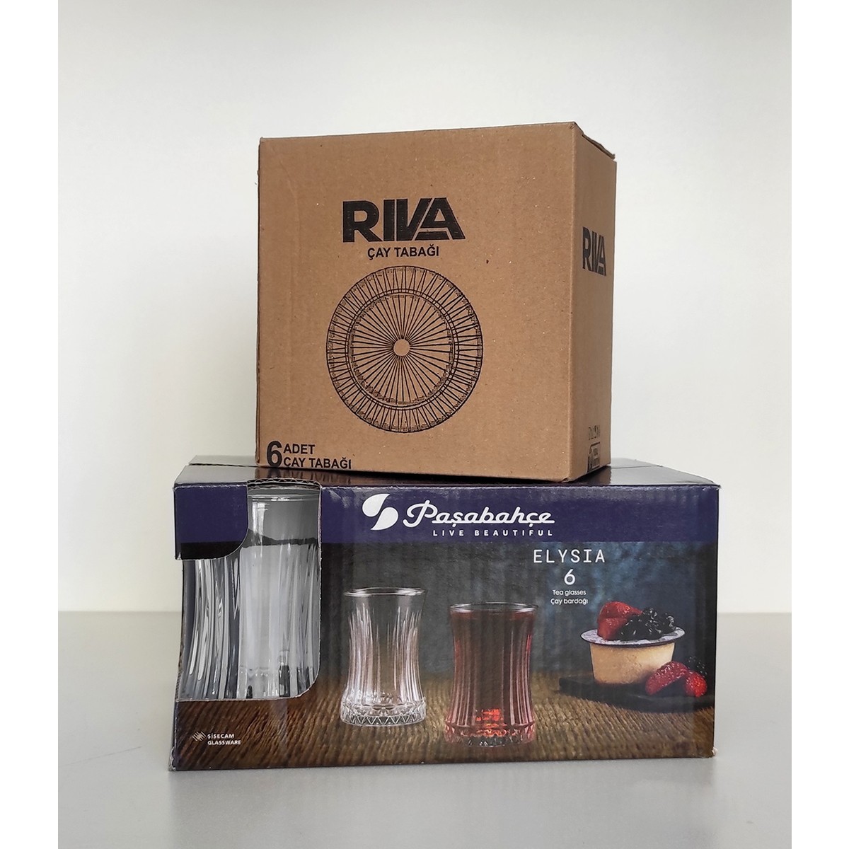 Paşabahçe Elysia Toplam 12 parça çay takımı. 6 adet çay bardağı. 6 adet çay tabağı. Çay Tabakları Elysia Uyumlu İthal Riva Markadır.