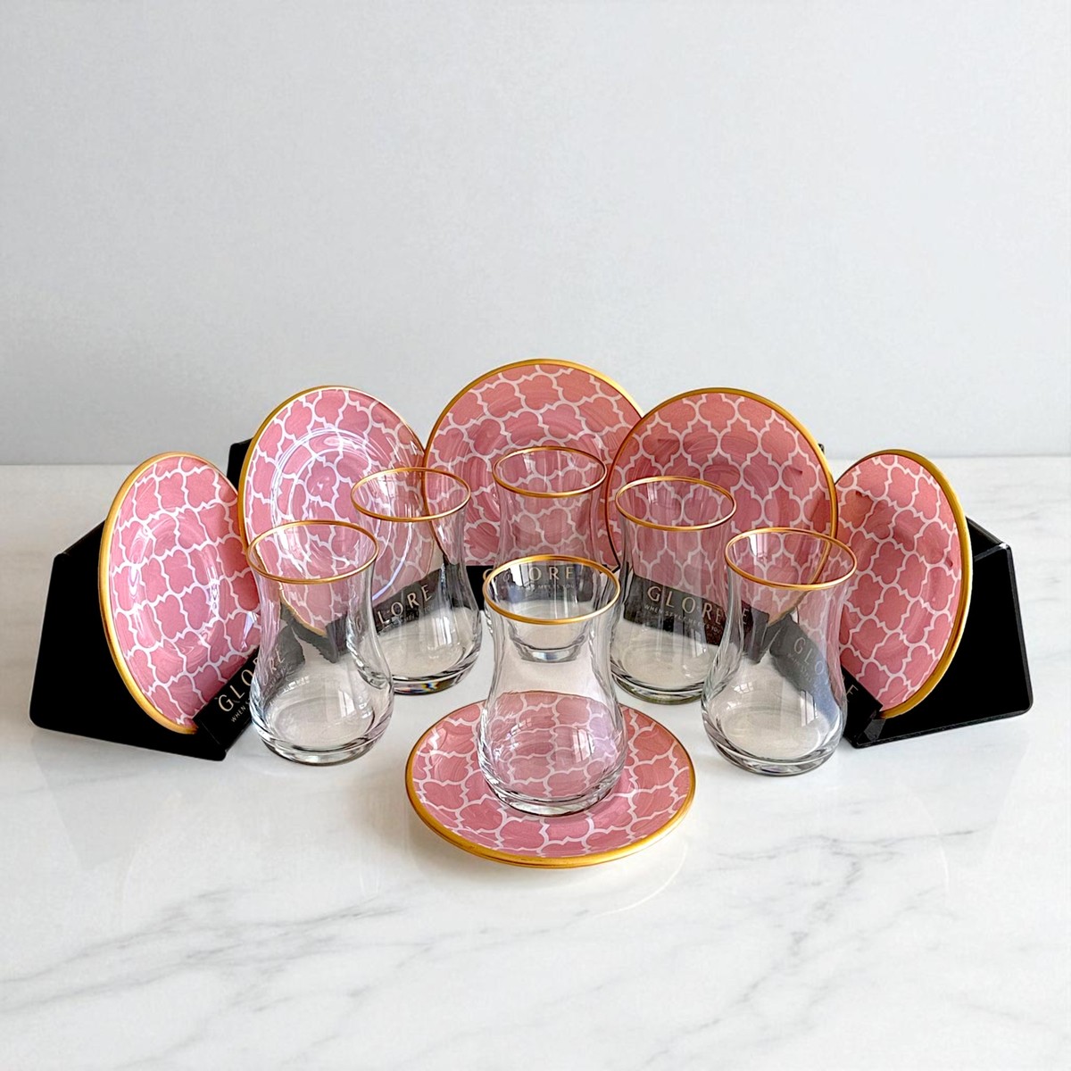 Pembe Geometrik Desenli 6’lı Cam Tabaklı Çay Bardağı Takımı – Sudedi Home