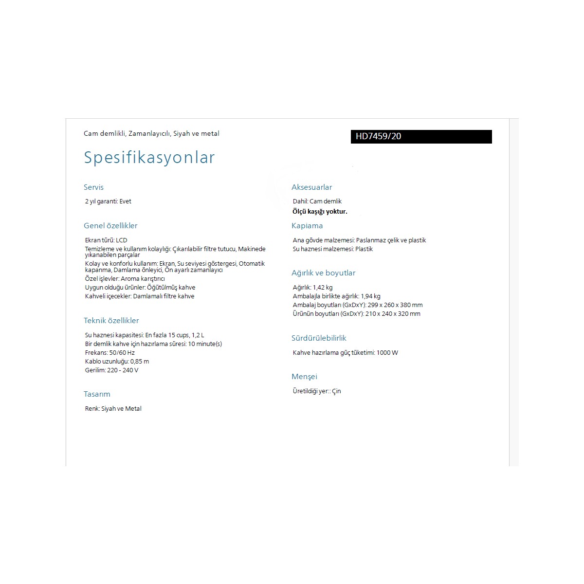 Philips Filtre Kahve Makinesi, 1,2 Lt Kapasite, Otomatik Kapanma, Cam Demlikli, Kolay Doldurma, Zamanlayıcı, HD7459/20