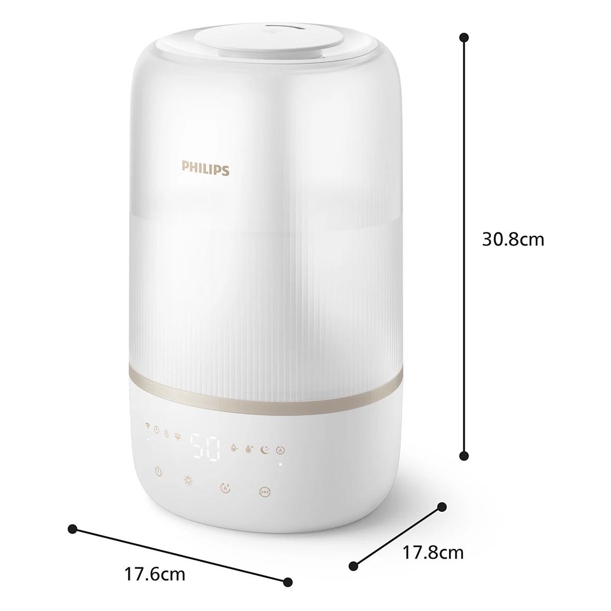 3 litrelik geniş su haznesi, dakikada 275 ml’ye kadar nem çıkışı ve 16-17 m² büyüklüğündeki odalar için ideal kapasitesi ile öne çıkıyor. Üstten doldurulabilen su haznesi sayesinde pratik kullanım sunar. Sessiz çalışma modu sayesinde geceleri rahatsız etmeden çalışabilir ve yaklaşık 19 dB ses seviyesine kadar düşer. Cihazda üç farklı fan kademesi bulunur ve otomatik nem kontrolü ile ortam nemini %40 ile %70 arasında sabit tutar. Wi-Fi bağlantısı ve Philips Air+ uygulaması ile uzaktan kontrol imkânı verir. 360° dönebilen buhar çıkış ucu sayesinde nem tüm odaya eşit dağılır. Ek olarak, 1 ila 12 saat arasında ayarlanabilir zamanlayıcı fonksiyonu, cihazın ne kadar süre çalışacağını planlamanıza olanak tanır. Gece modu ile ışıklar kısılır ve fan hızı düşürülerek uyku sırasında daha sessiz bir ortam sağlanır.