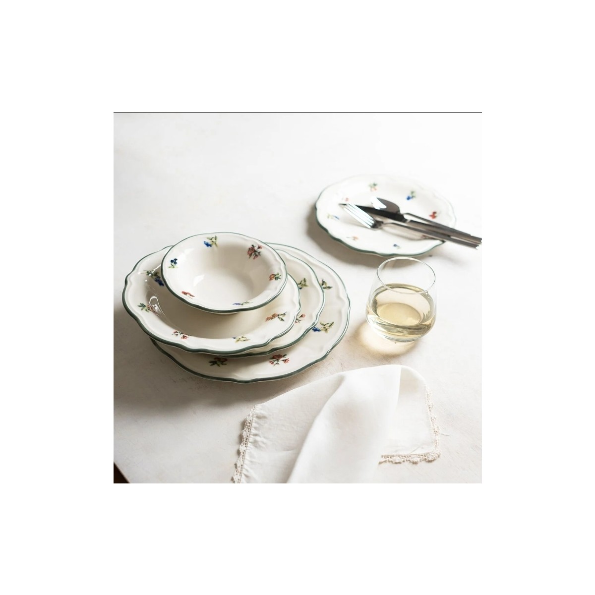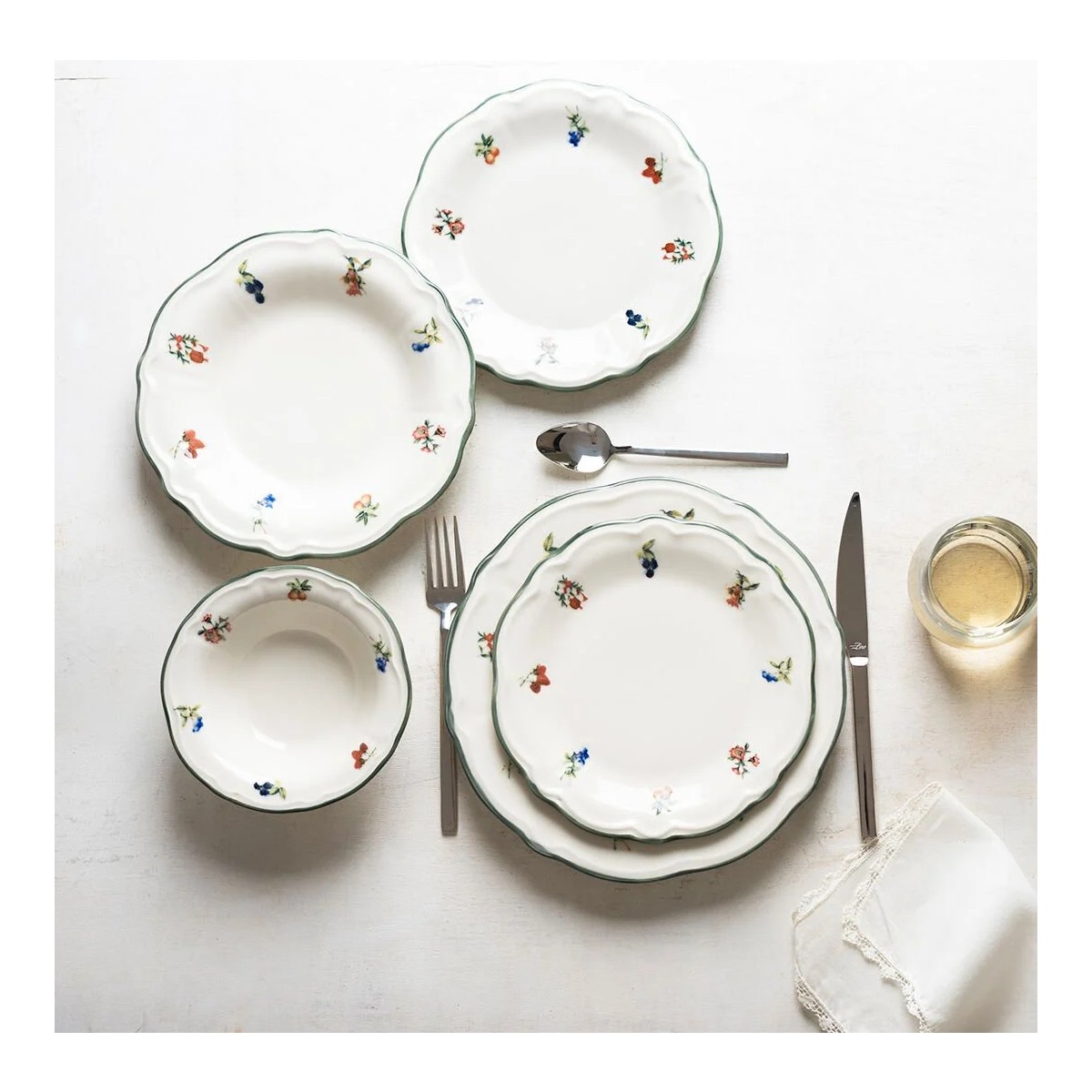 Her tabağın üzerinde farklı çiçek motifleri ve ince yeşil hatlı kenarlar, takıma doğal bir şıklık ve sıcaklık katıyor. Modern rustik ve vintage tarzı bir araya getiriyor.