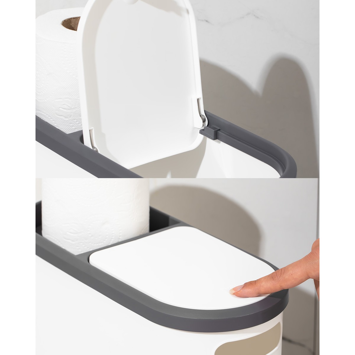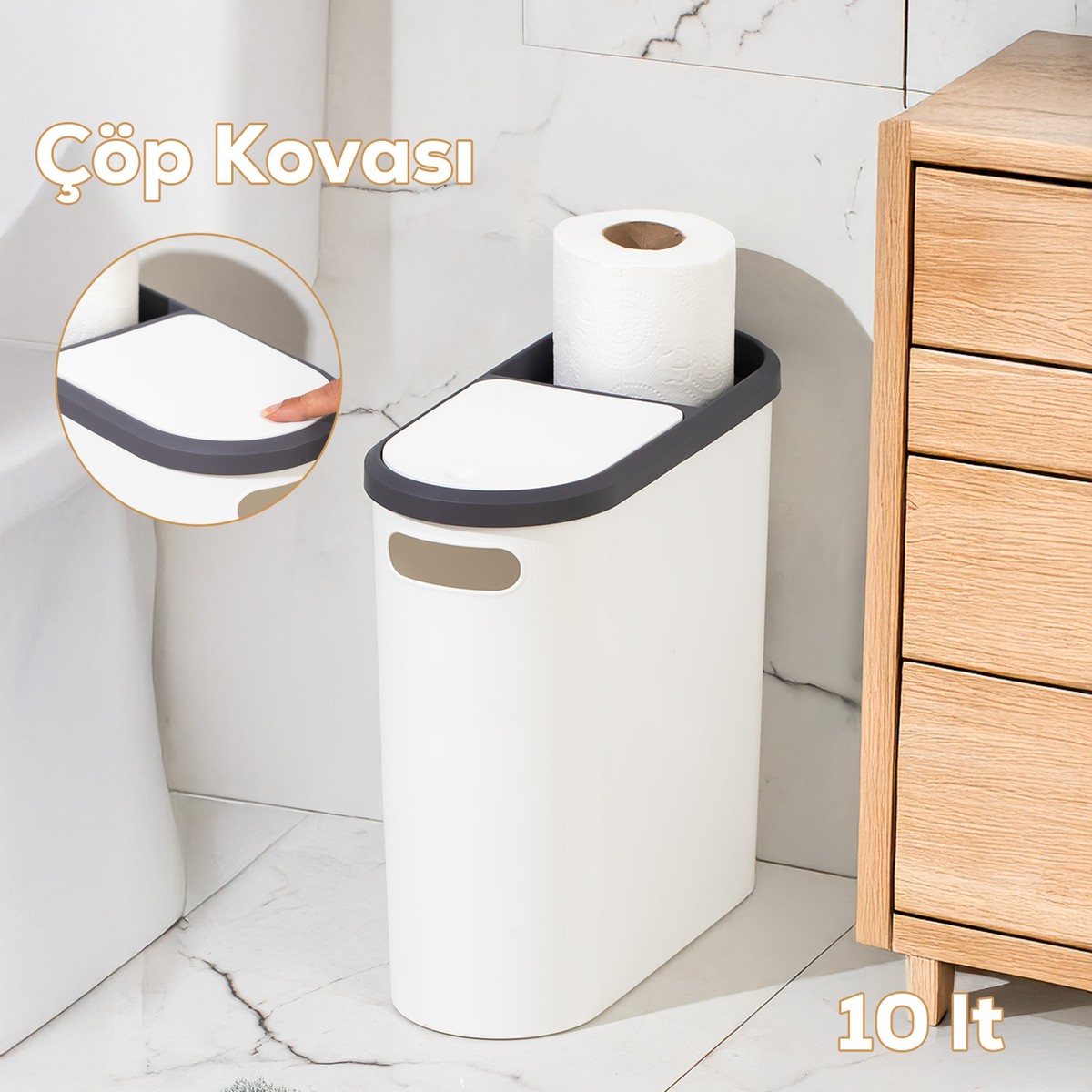 Banyo ve mutfaklar için pratik ve şık bir çözüm sunan çöp kutusu, kullanıcının ihtiyaçlarına göre tasarlanmıştır.