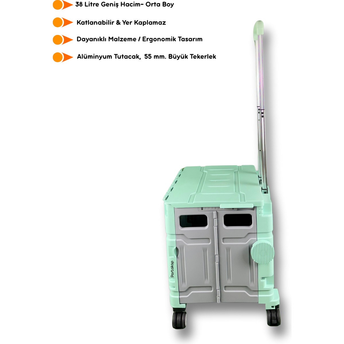 Portakap 38 litrelik orta boy alışveriş arabası, dayanıklı hareketli alüminyum tutacak ve 55 mm büyük tekerlekleri ile rahat kullanım sağlar. Canlı yeşil rengiyle alışverişlerinize enerji katar.