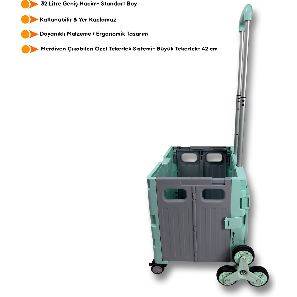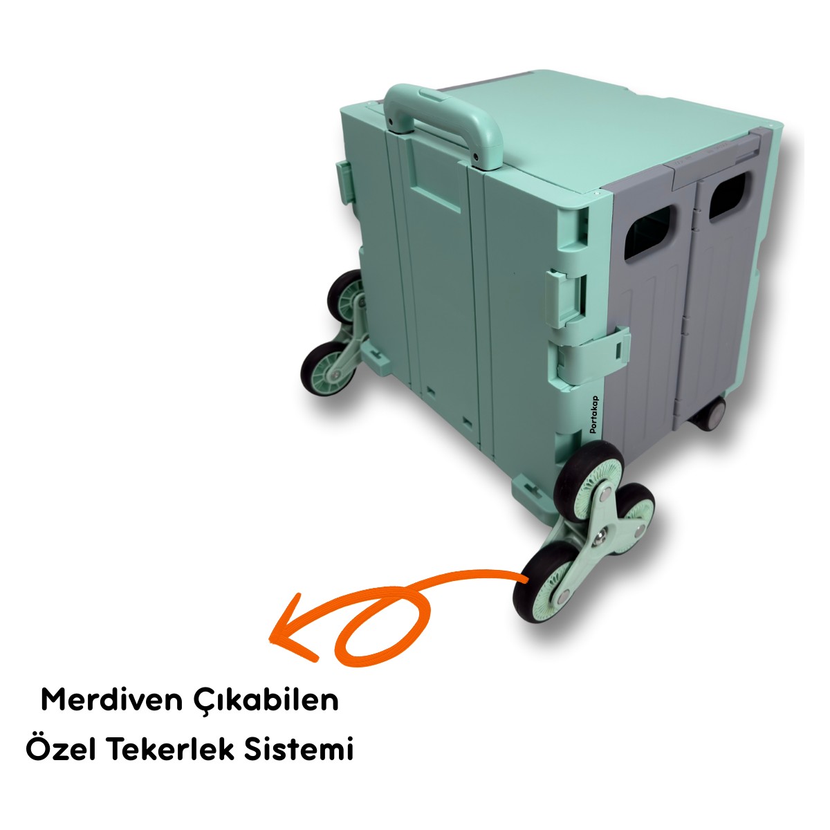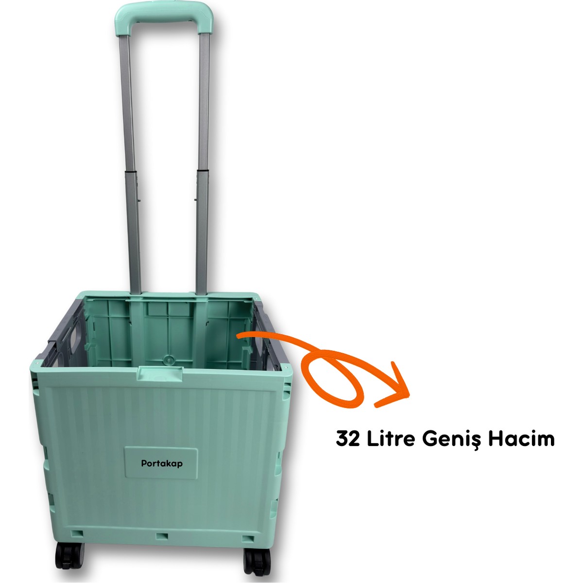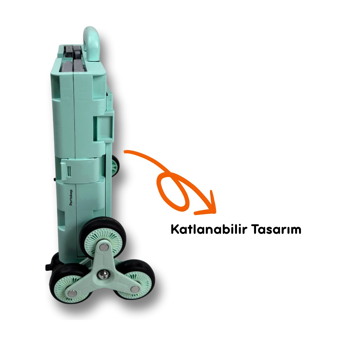 Portakap 32 Litre Yeşil Katlanır Alışveriş Arabası; kompakt tasarımı, 8 tekerlekli merdiven çıkabilen yapısı ve sabit tutacaklı formu ile şehir yaşamında pratik çözümler sunar.