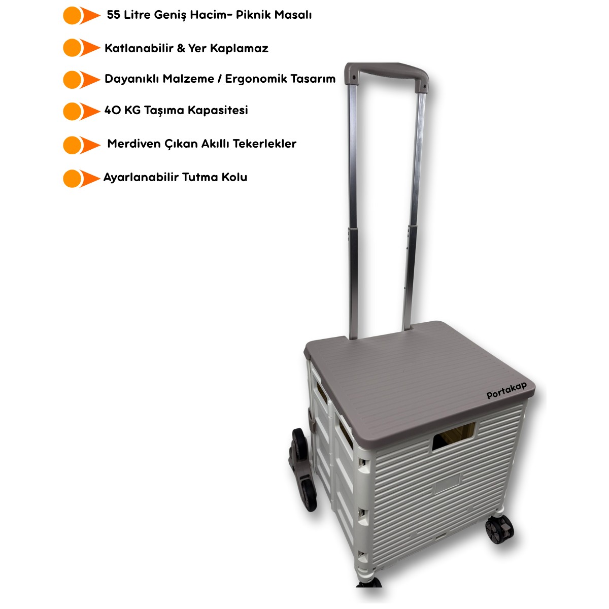 Portakap Piknik Masalı Alışveriş Arabası, 55 litrelik geniş iç hacmi, merdiven çıkabilen 8 tekerlekli özel tasarımı ve üst tablasıyla kullanıcıya benzersiz bir kullanım deneyimi sunar.