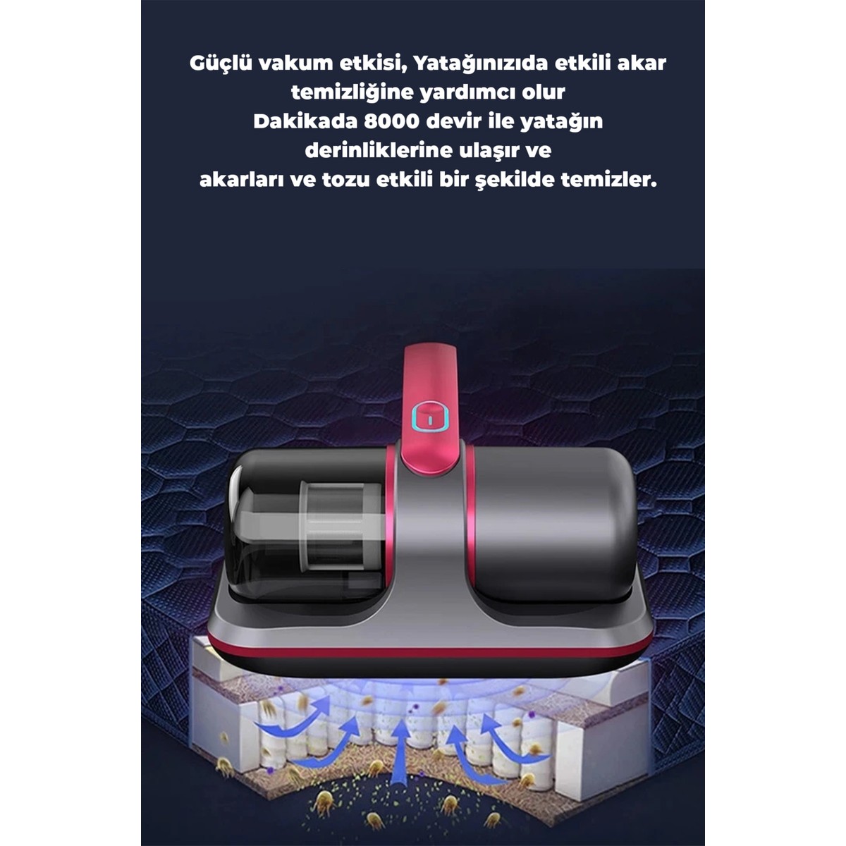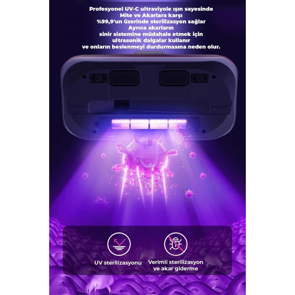 robo şarjlı el süpürgesinin uv ışığı akarların dna yapılarına doğrudan etki eder böylece onları %99,99 oranında öldürebilen bir ışıktır.