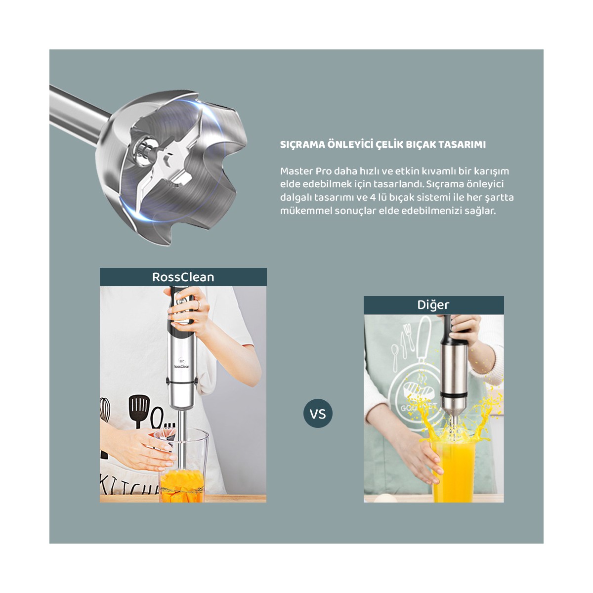 RossClean Master Pro El Blenderi Çubuk Blender 1000W 4 Bıçaklı Çelik Tasarım