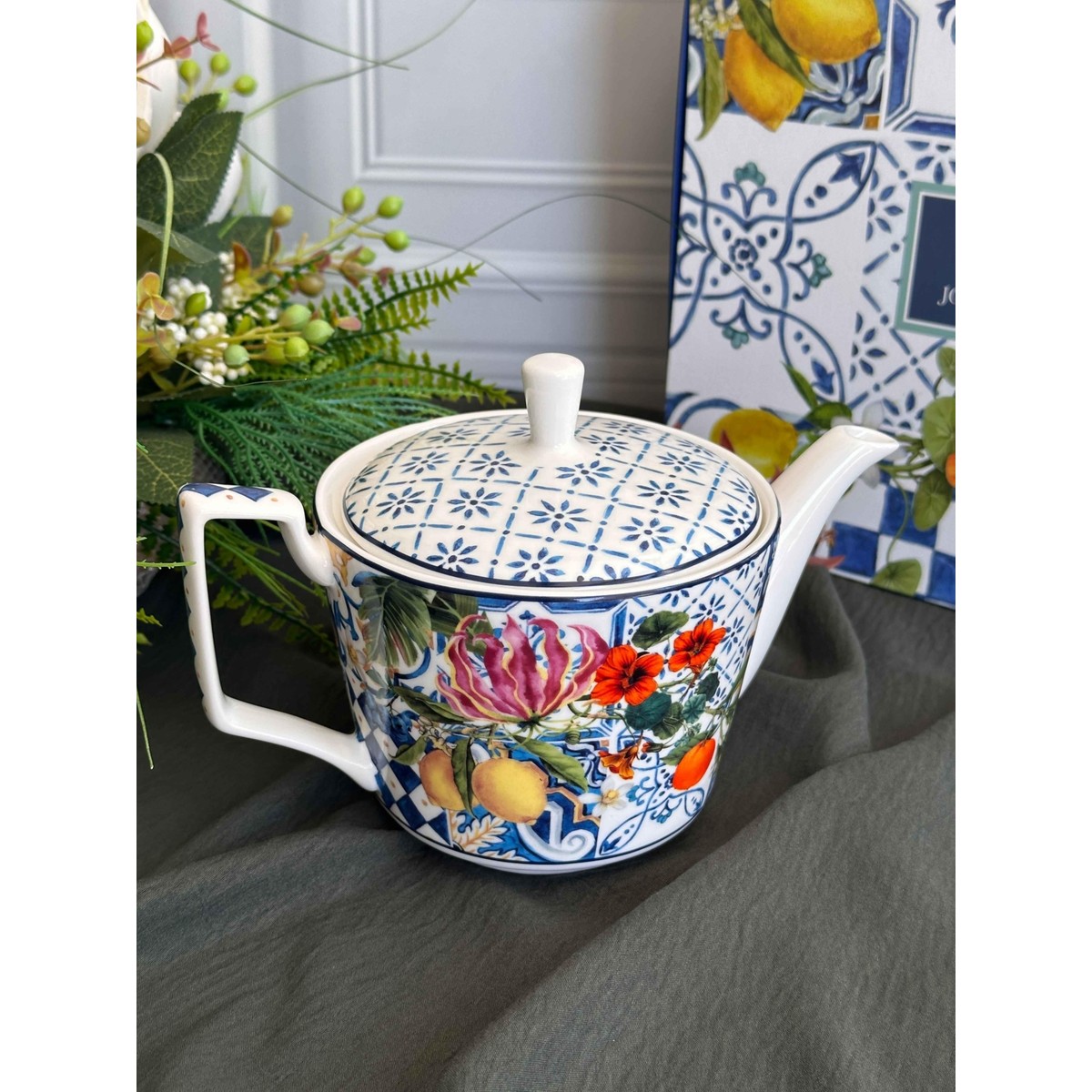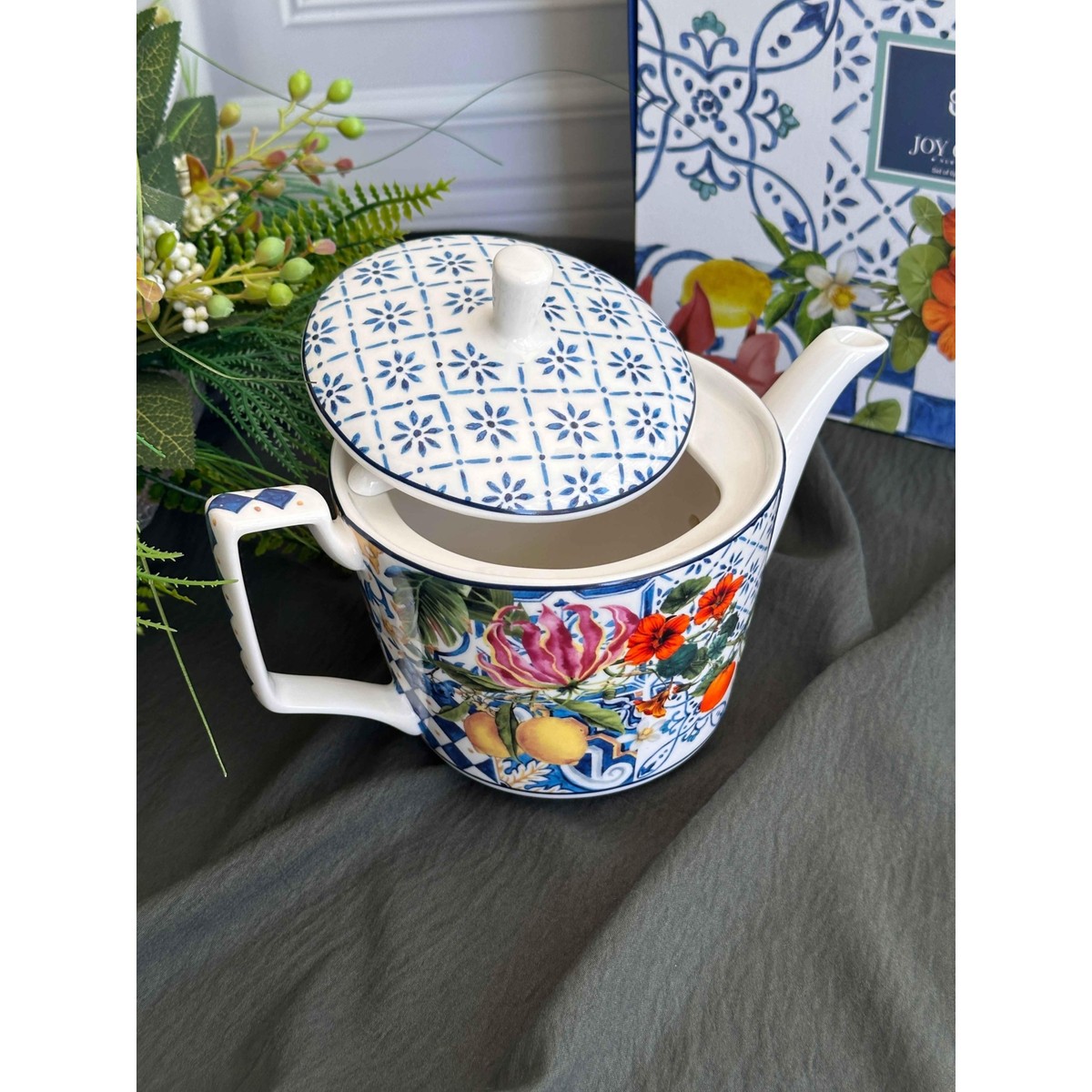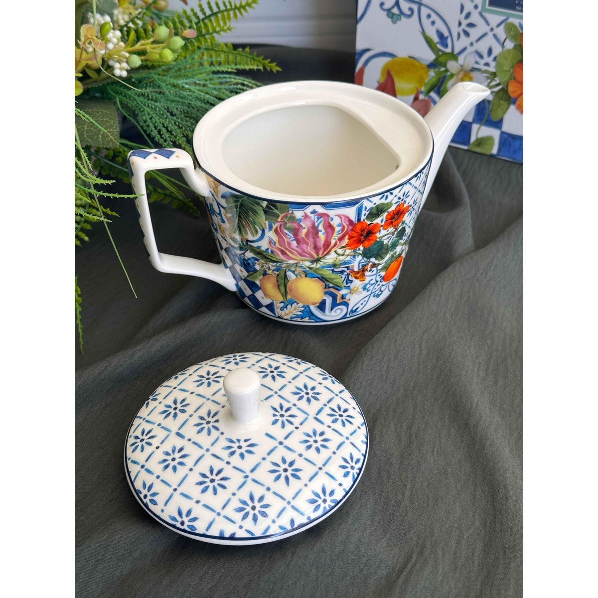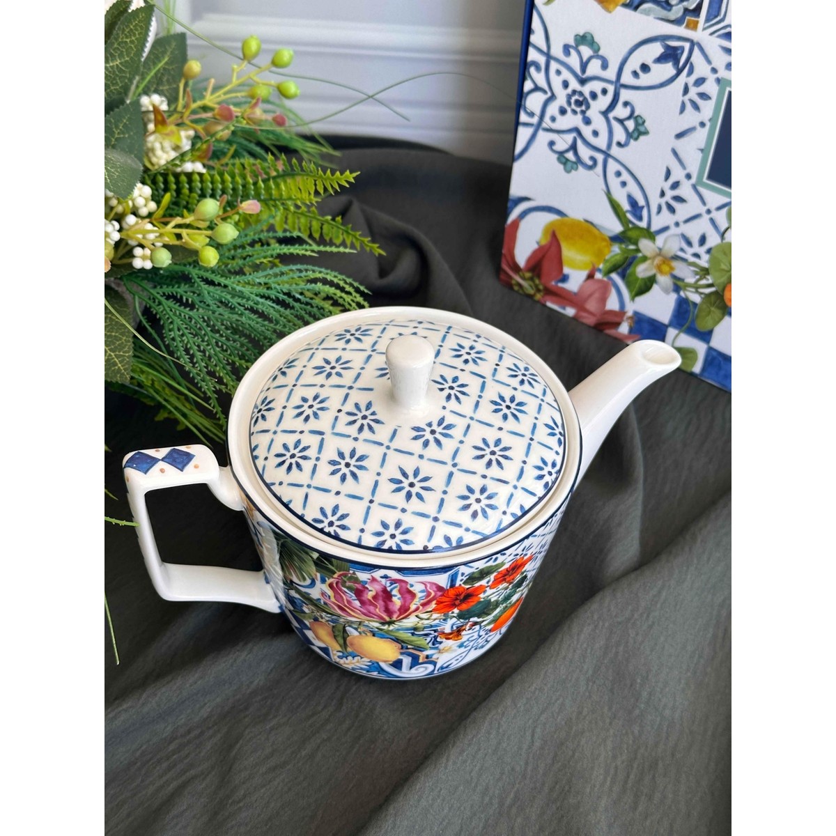 Italy Garden kapaklı demlik, lacivert-beyaz dama etnik deseni , limon,nar ve çiçek motifleri ile çay saatlerinize estetik bir dokunuş katıyor. Şık tasarımı sayesinde yalnızca günlük kullanımda değil, özel davetlerde de sofralarınızı güzelleştirir. İnce işçiliği ve dekoratif görünümü ile hem kullanışlı hem de göz alıcı bir üründür.