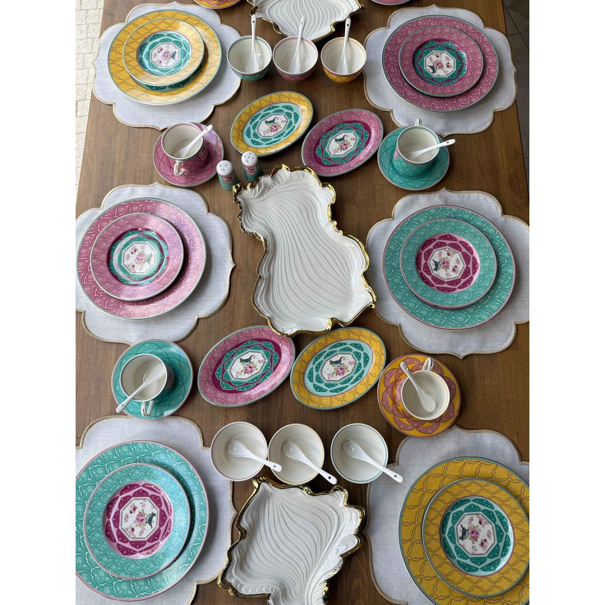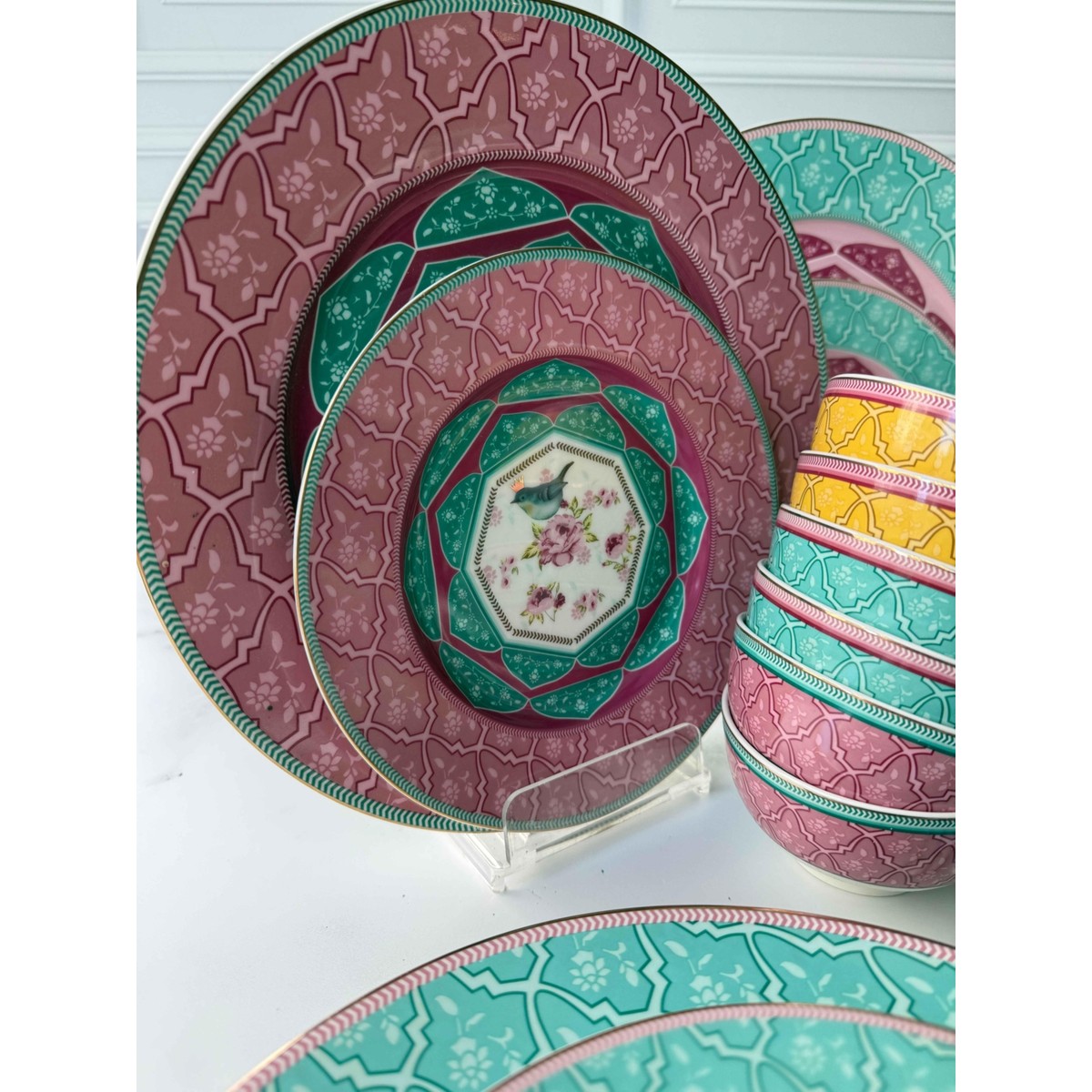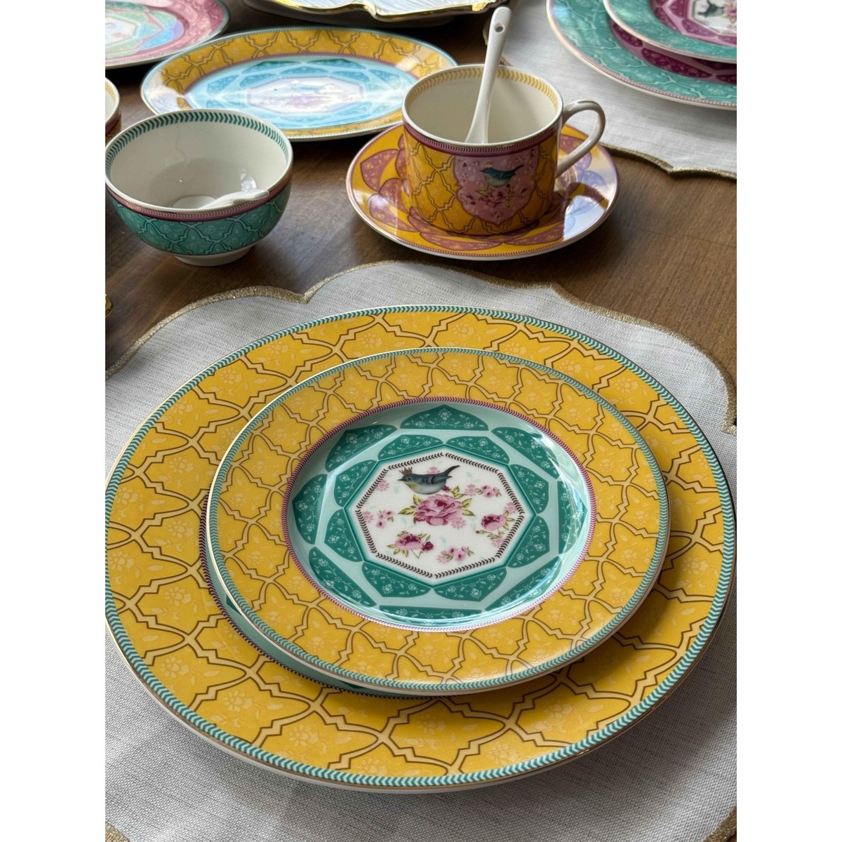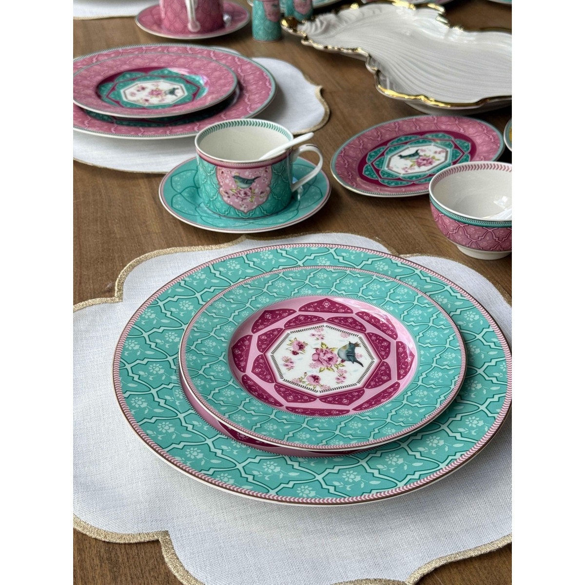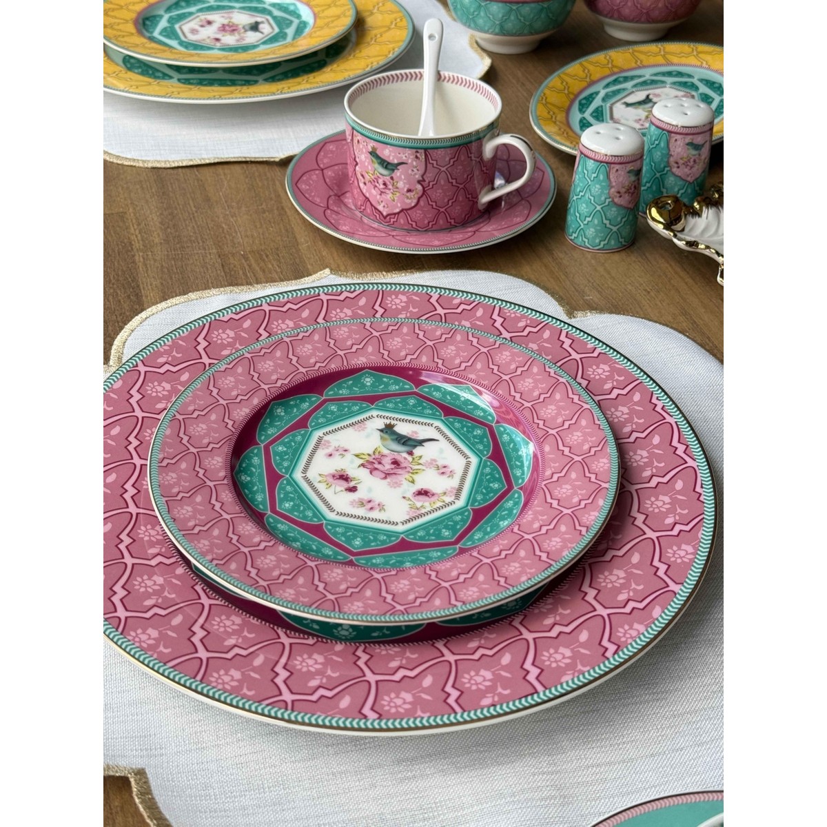 Canlı renkleri ve zarif desenleriyle dikkat çeken bu kahvaltı takımı, sofralara neşe ve zarafet kazandırır. Pembe, sarı ve mint yeşili tonlarının bir arada kullanıldığı tasarım, klasik motiflerle modern bir tarzı birleştirir. Her tabak ve fincanda yer alan kuş figürleri, takımın enerjik görünümüne romantik bir dokunuş katar.