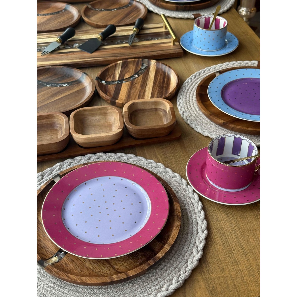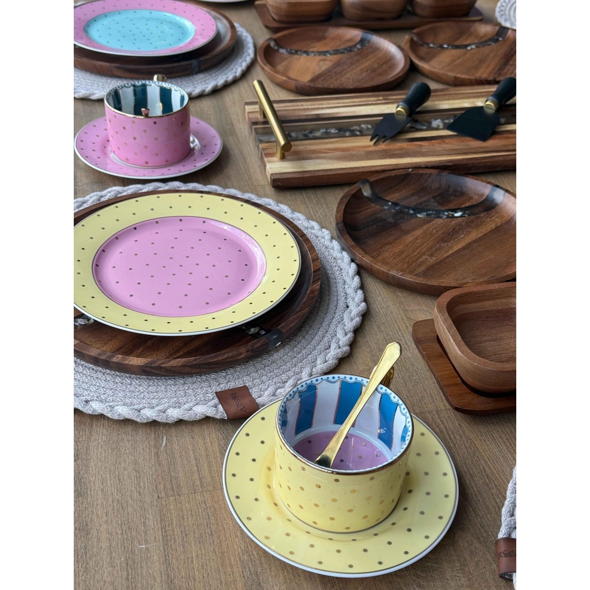 Pasta tabakları ve çay fincanları 6 farklı renkten oluşarak sofranıza canlılık getirirken, doğal akasya servis ürünleriyle tamamlanan set, hem günlük kullanım hem de misafir sofraları için ideal bir tercih.